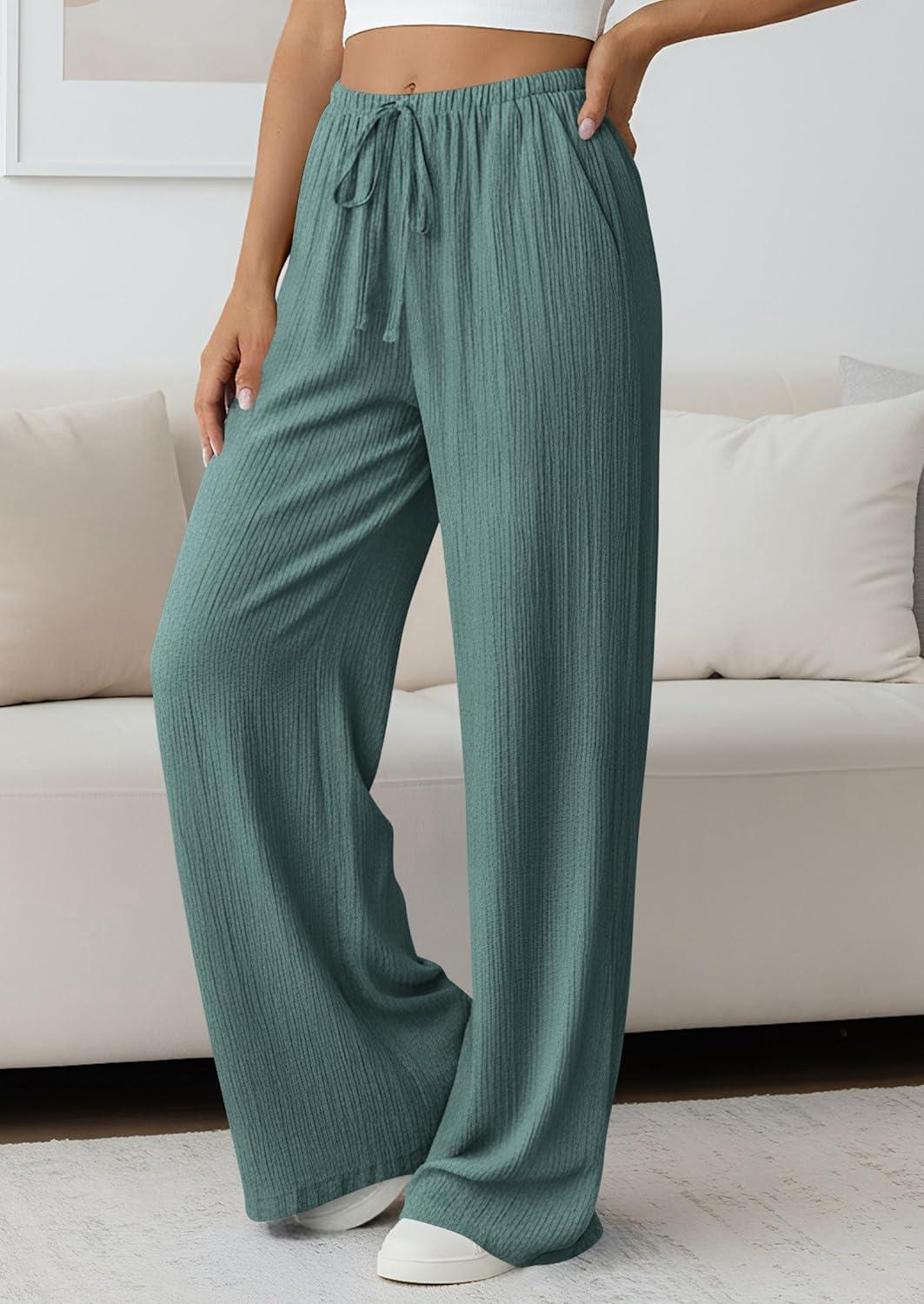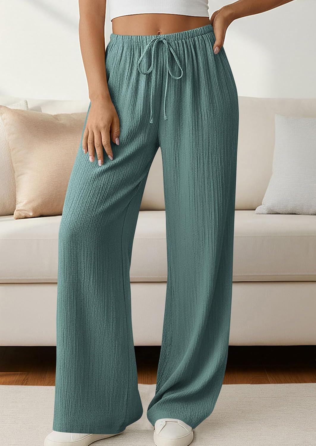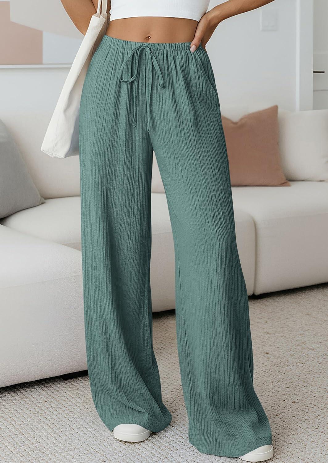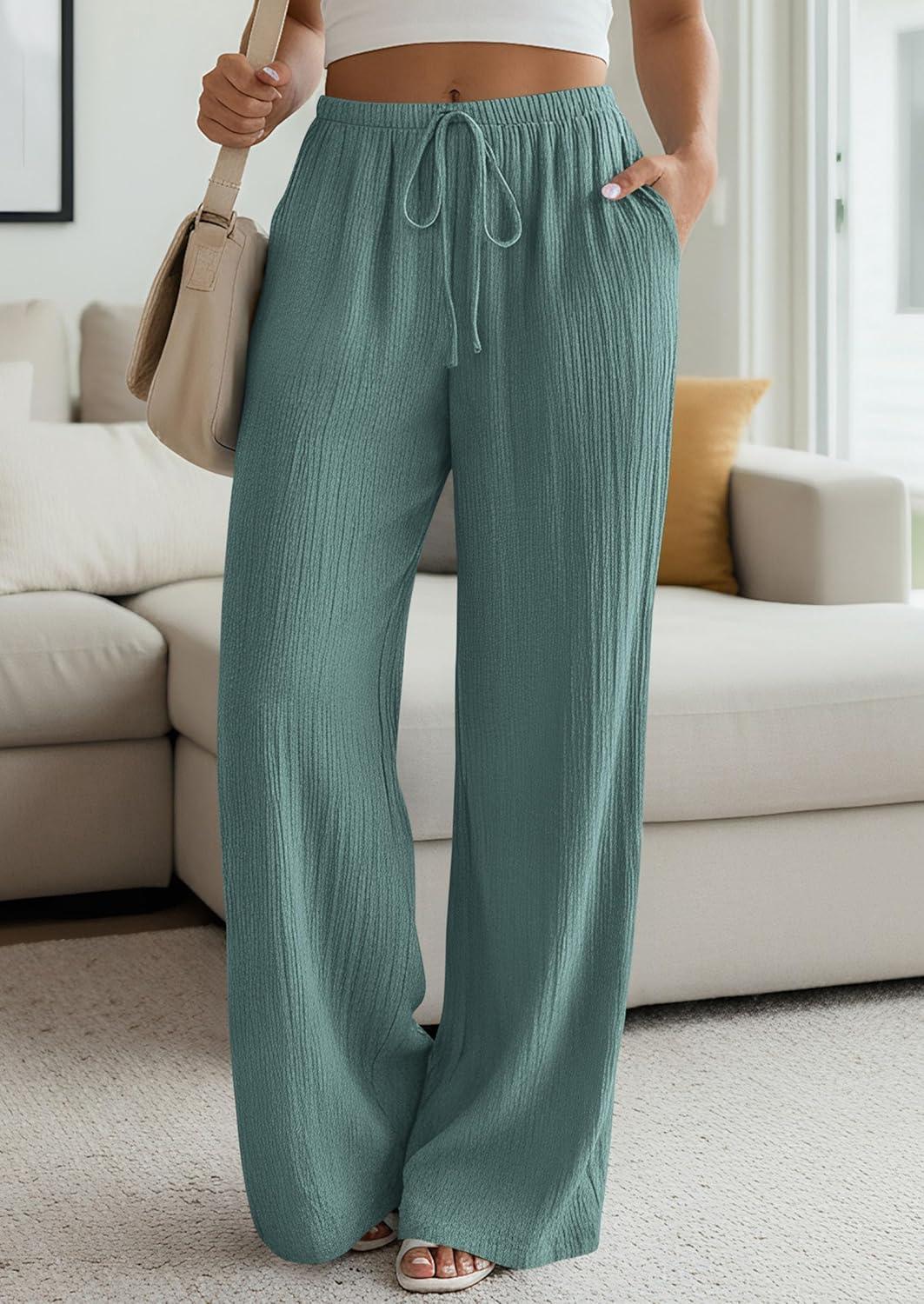 PRETTYGARDEN Womens Palazzo Pants Summer Fashion 2026 High Waisted Wide Leg Drawstring Flowy Beach Trousers with Pockets(Blue Green)