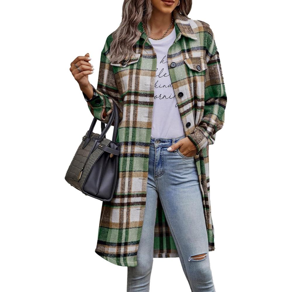 PRETTYGARDEN Womens Plaid Shacket Jacket Fall Fashion 2025 Long Sleeve Button Up Flannel Shirt Winter Clothing Woolen Coats(Green)