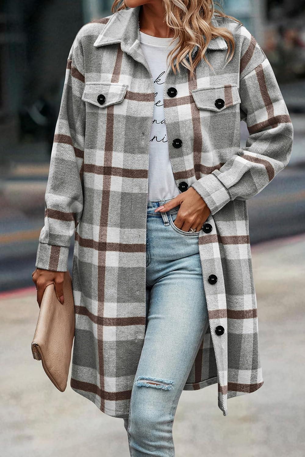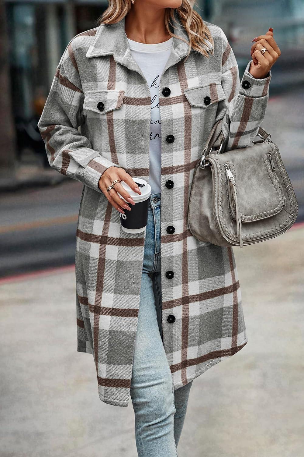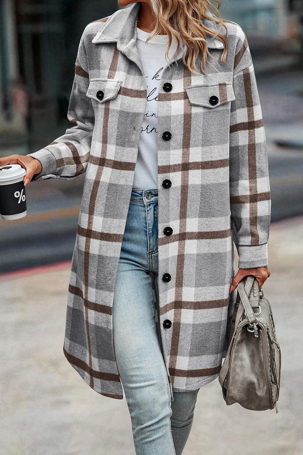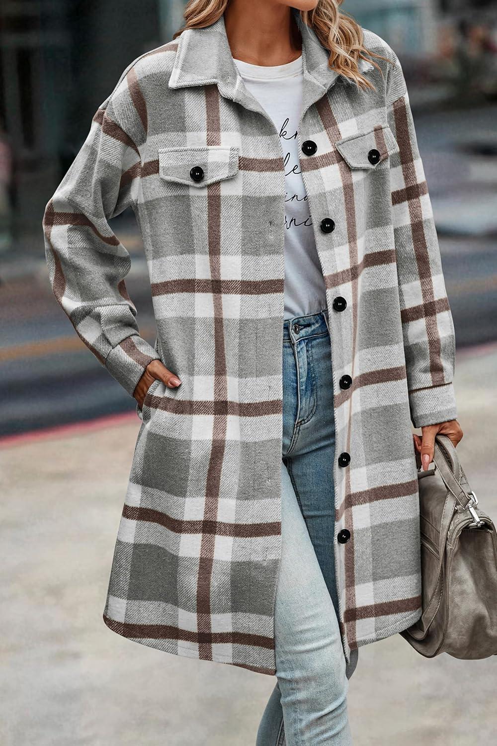 PRETTYGARDEN Womens Plaid Shacket Jacket Fall Fashion 2025 Long Sleeve Button Up Flannel Shirt Winter Clothing Woolen Coats(Plaid Grey)