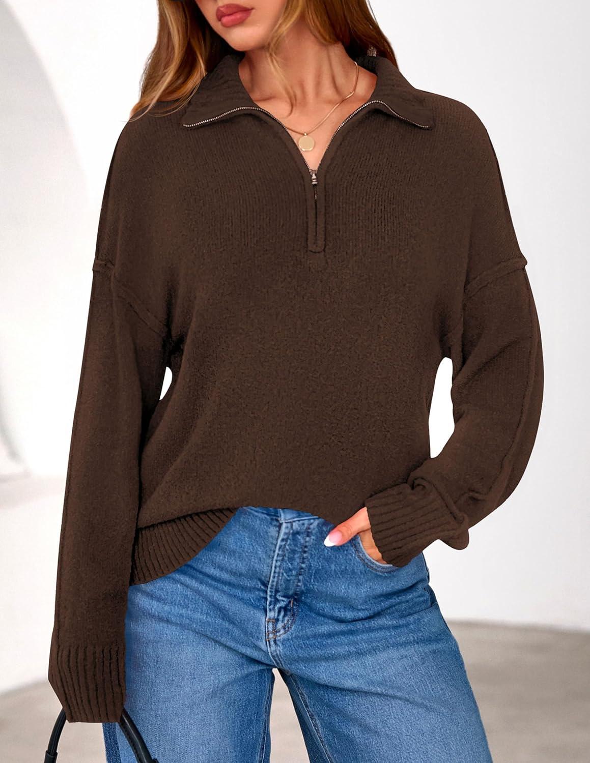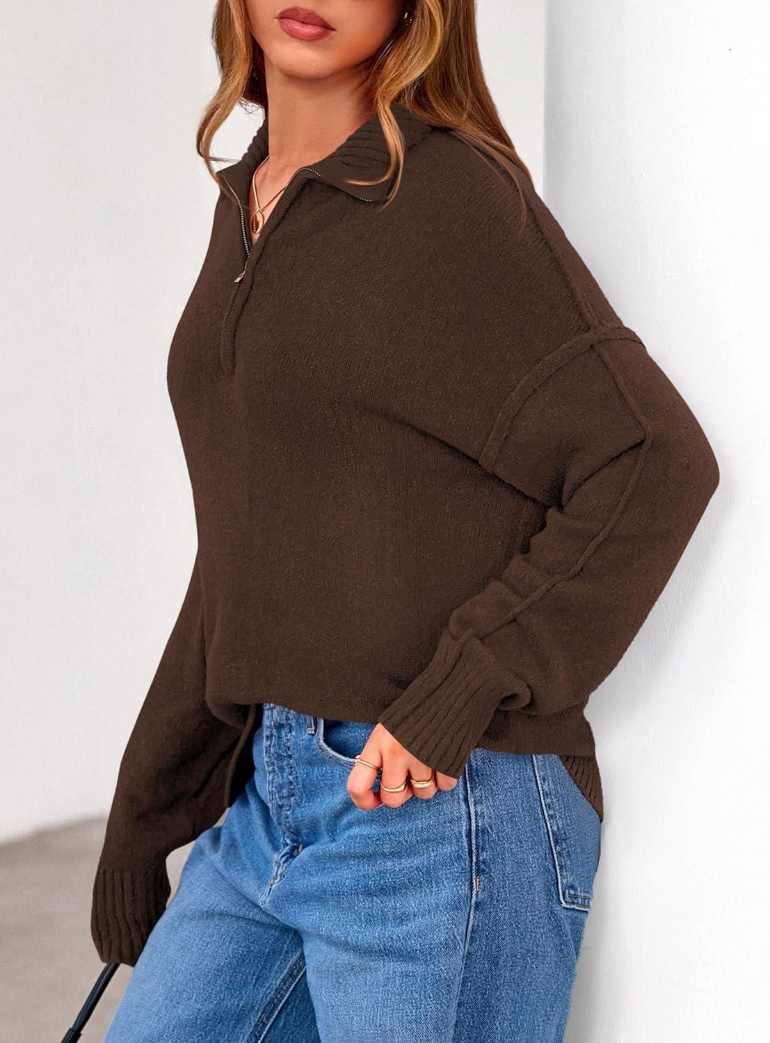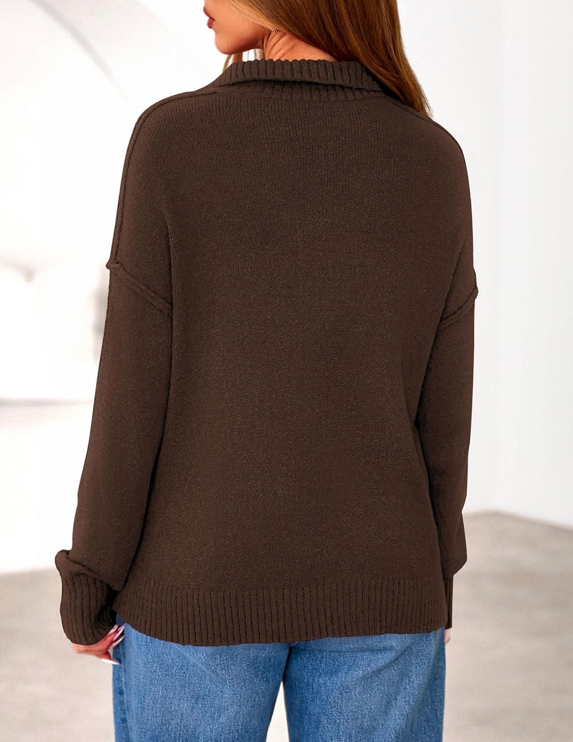 PRETTYGARDEN Womens Quarter Zip Pullover V Neck Fall Sweaters 2025 Long Sleeve Tops Collared Sweater Knit Winter Clothing(Brown)