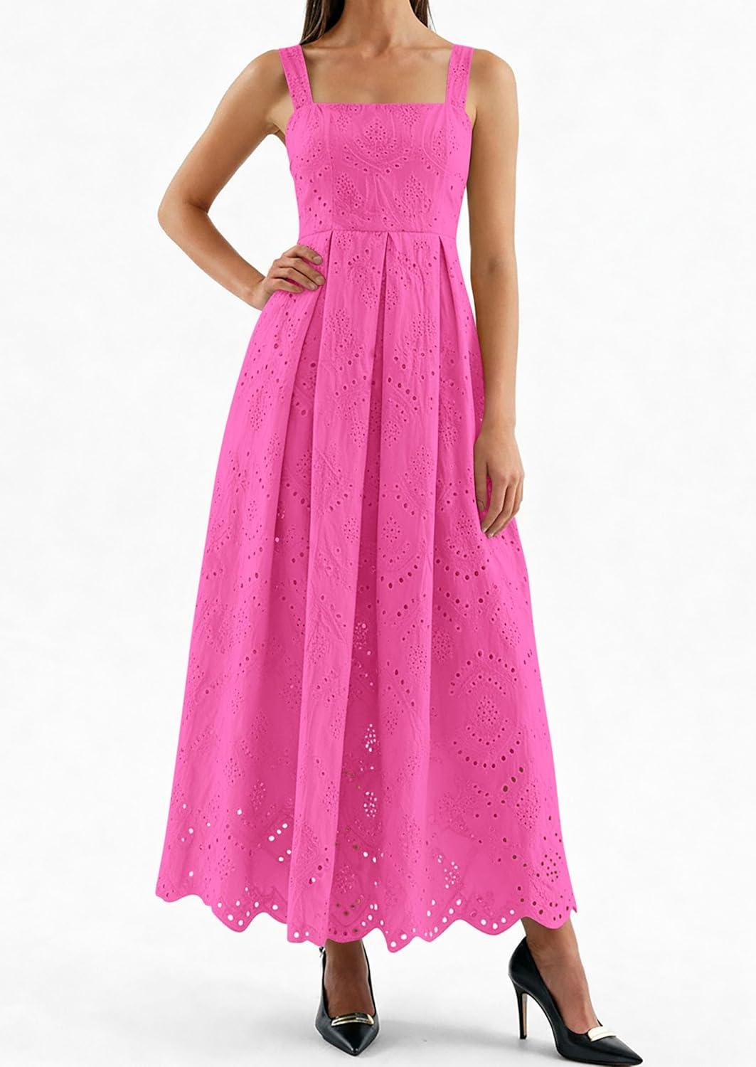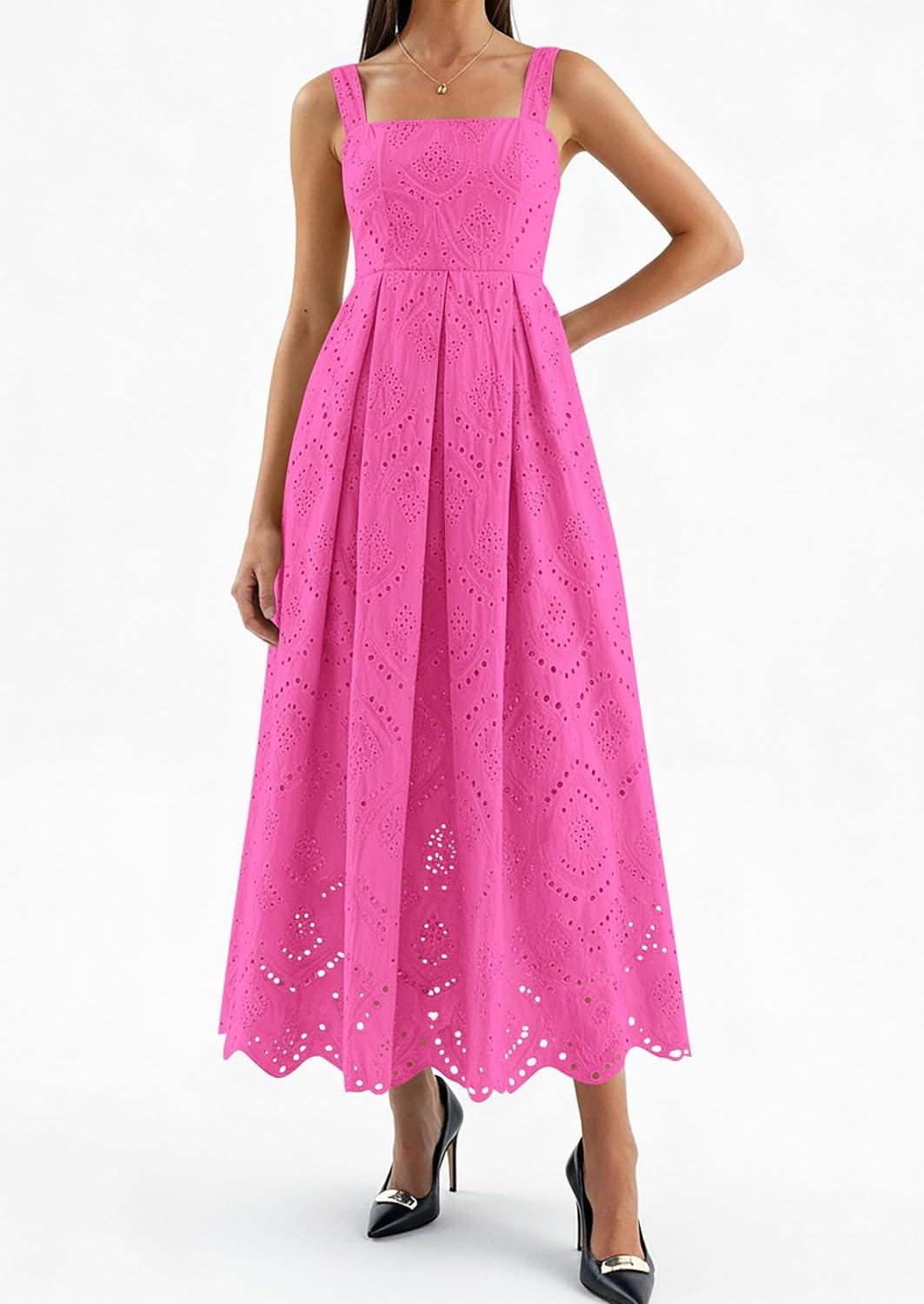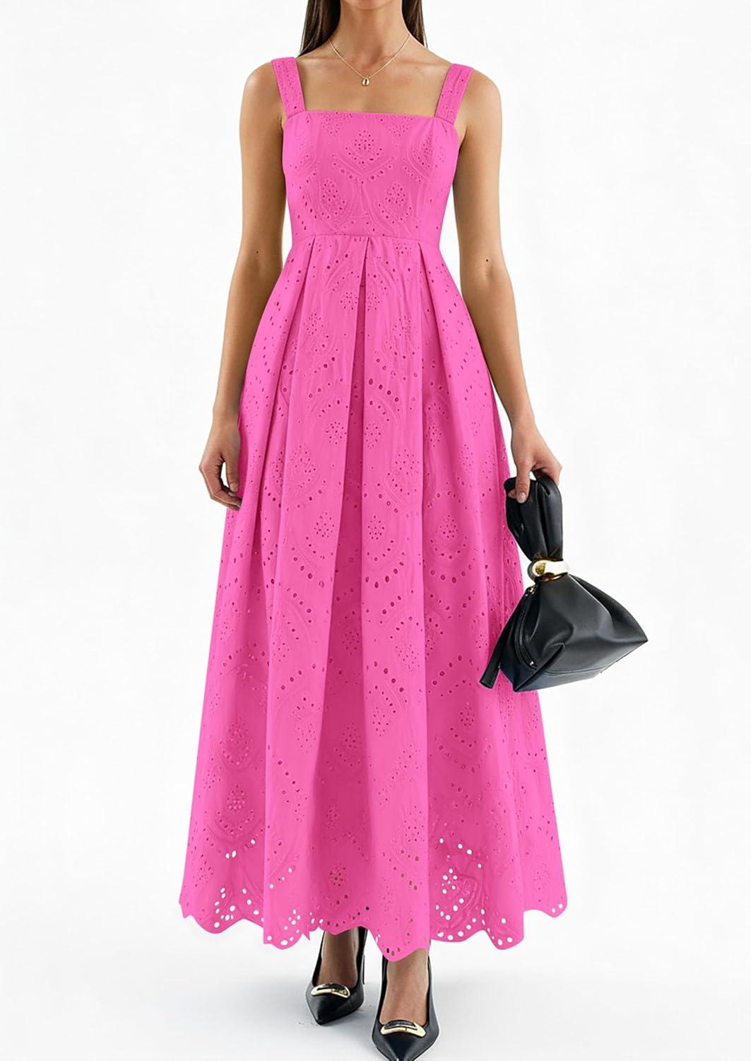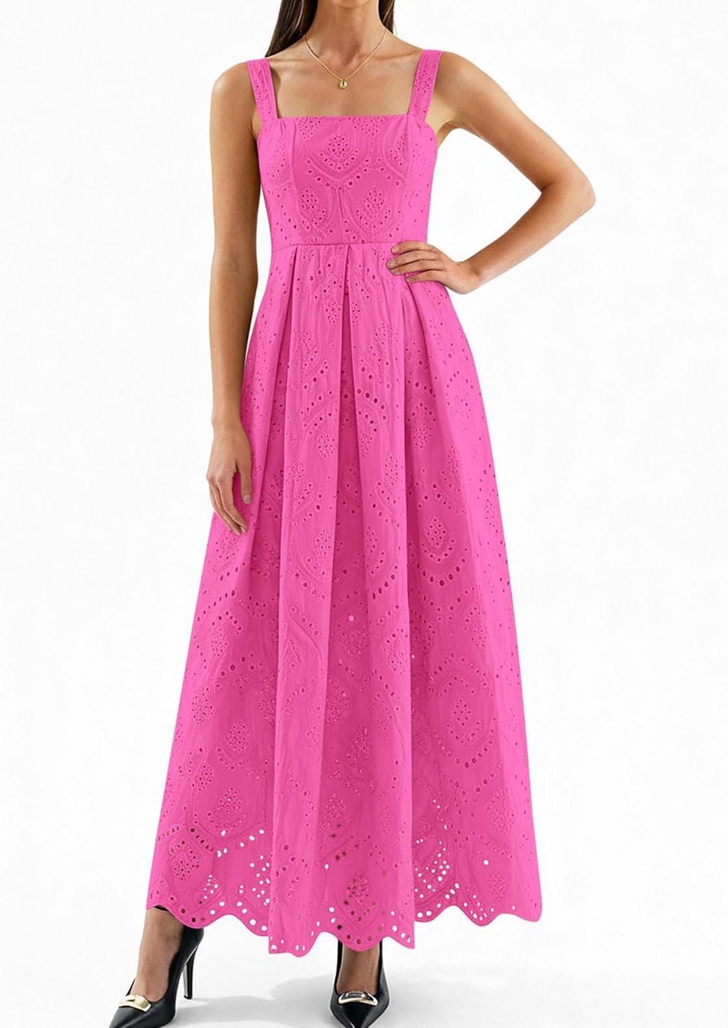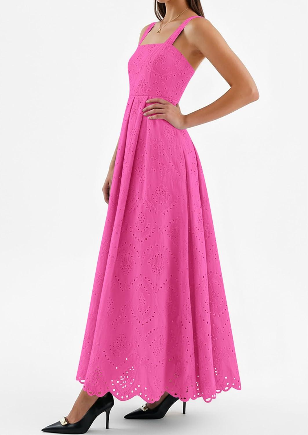 PRETTYGARDEN Womens Sleeveless Maxi Summer Dresses 2026 Hollow Out Eyelet Square Neck Ruffle Flowy Beach Vacation Sundress(Pink)