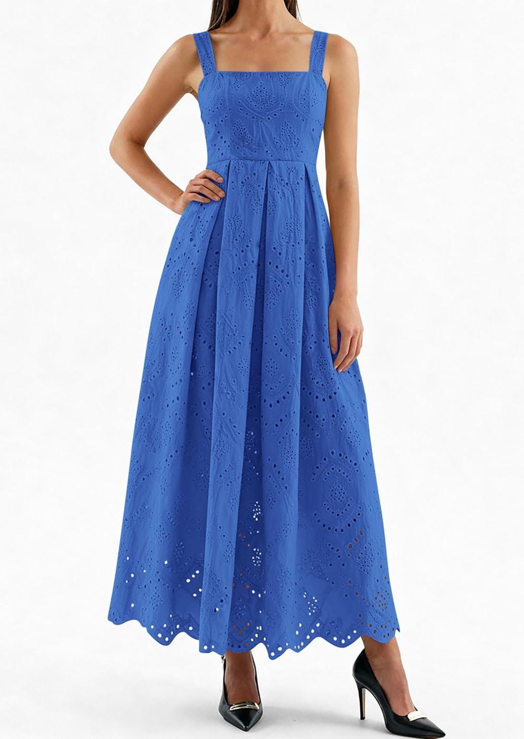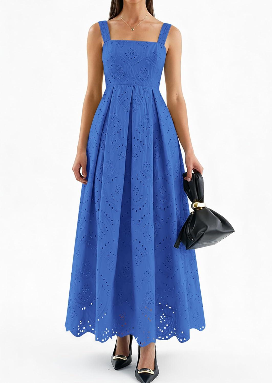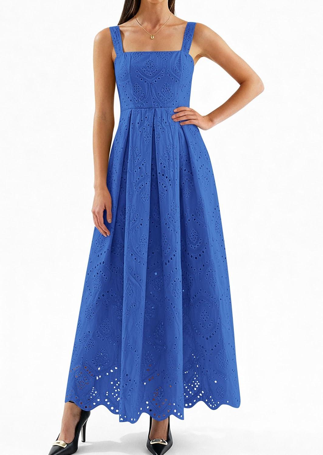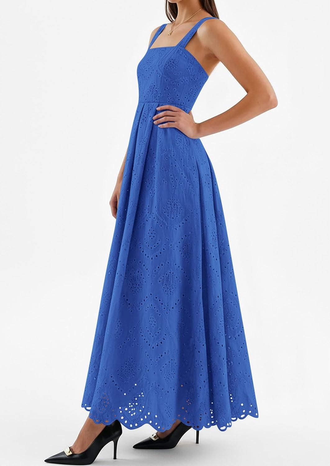 PRETTYGARDEN Womens Sleeveless Maxi Summer Dresses 2026 Hollow Out Eyelet Square Neck Ruffle Flowy Beach Vacation Sundress(Royal Blue)