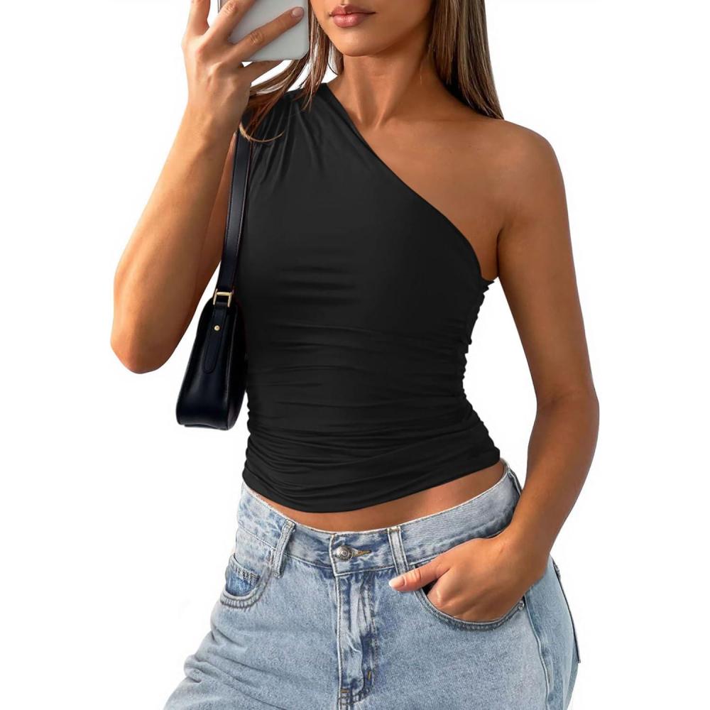 PRETTYGARDEN Womens Sleeveless One Shoulder Tank Top Ruched Slim Fit Shirts Basic Crop Y2k Tops 2026 Spring Fashion Clothing(Black)