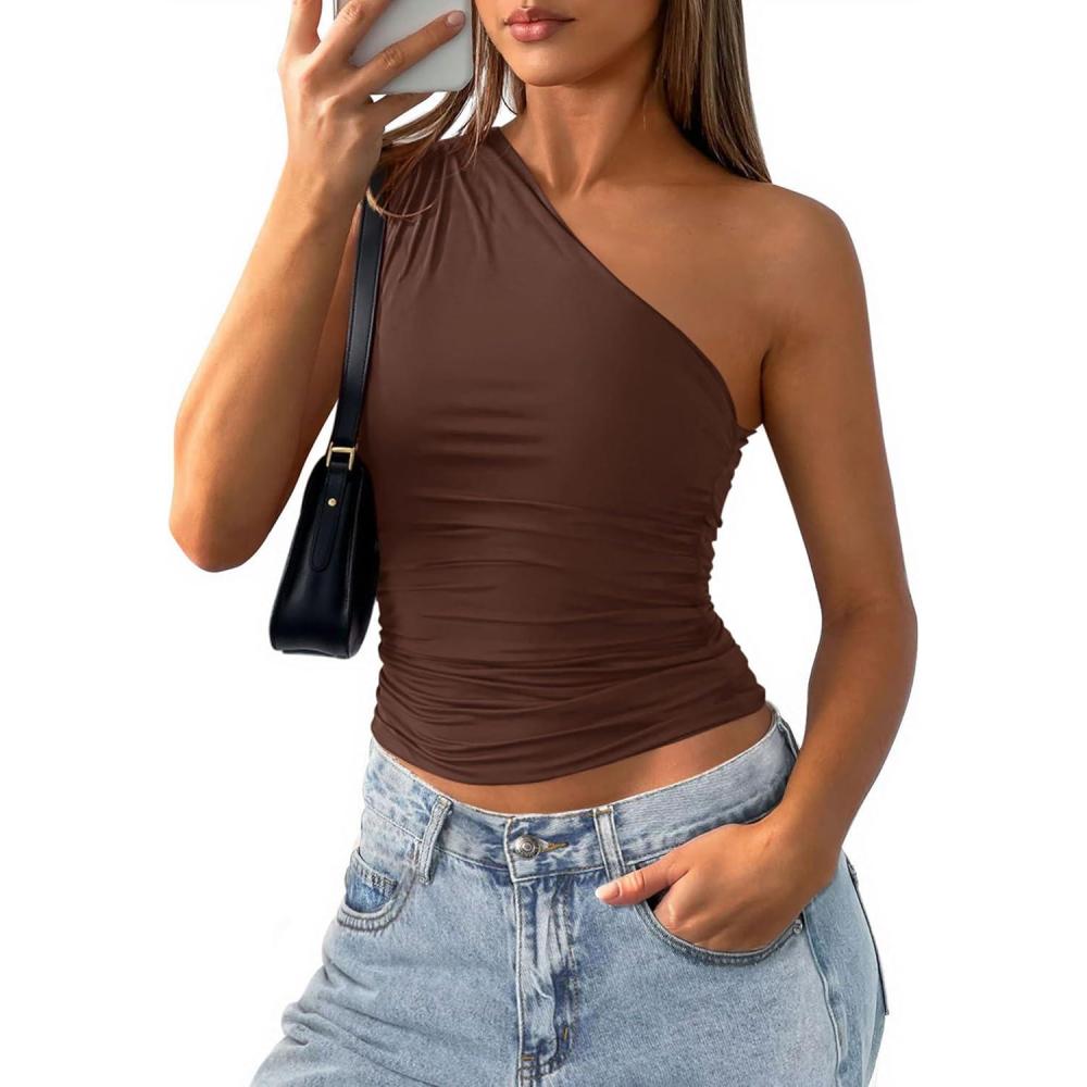 PRETTYGARDEN Womens Sleeveless One Shoulder Tank Top Ruched Slim Fit Shirts Basic Crop Y2k Tops 2026 Spring Fashion Clothing(Brown)