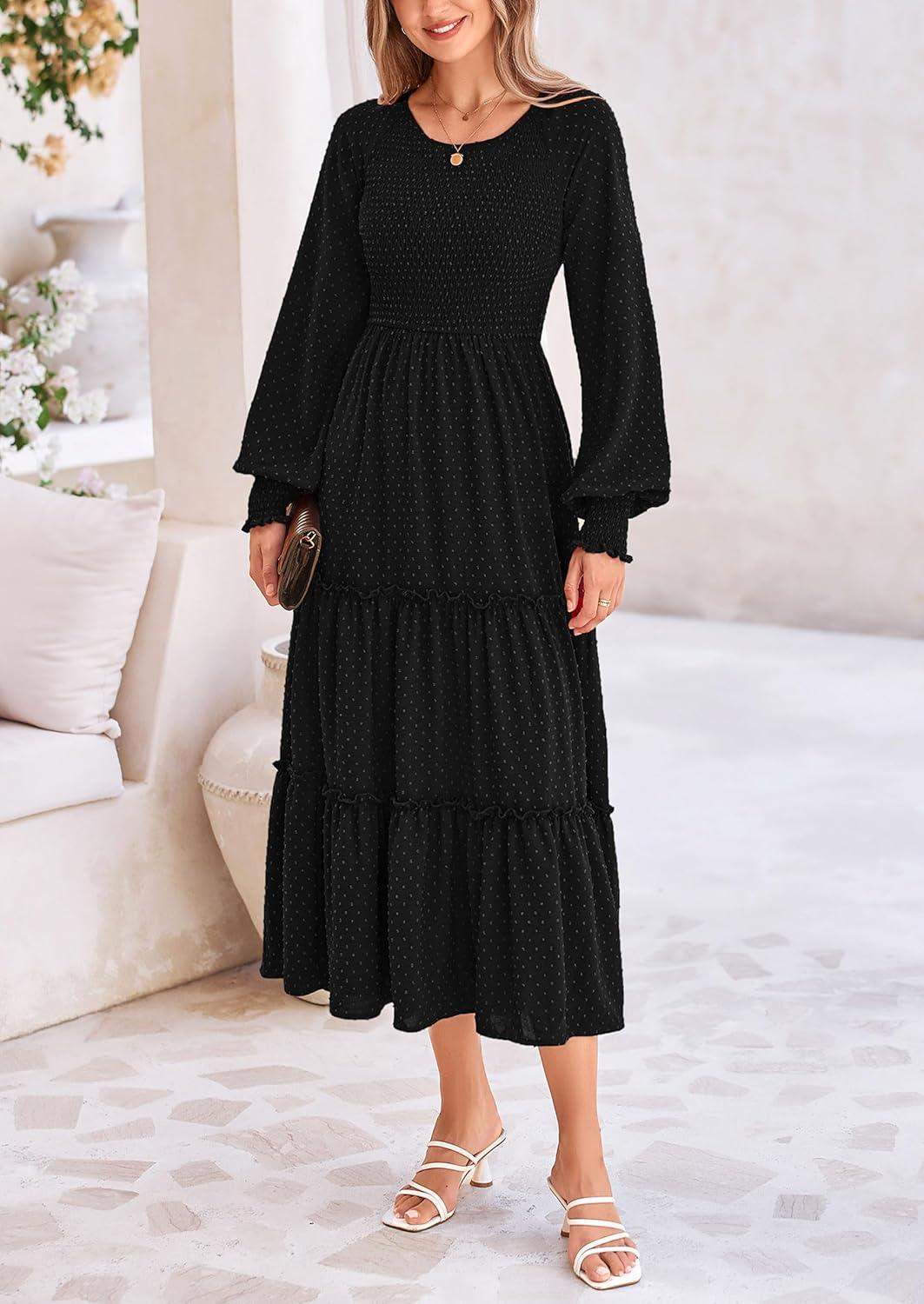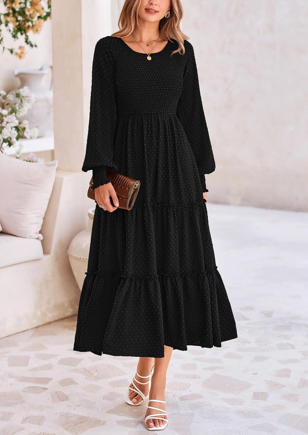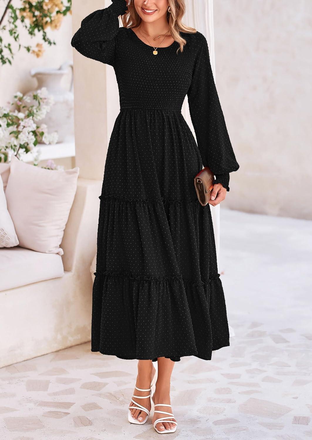 PRETTYGARDEN Women's Smocked Maxi Dress 2025 Fall Casual Long Sleeve Swiss Dot Ruffle Long Flowy Wedding Guest Dresses(Black)