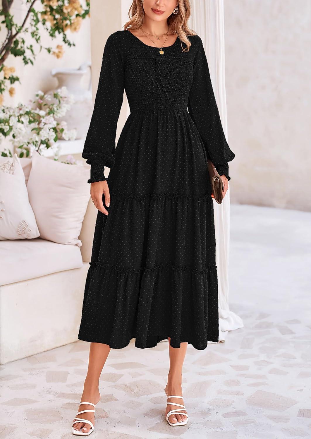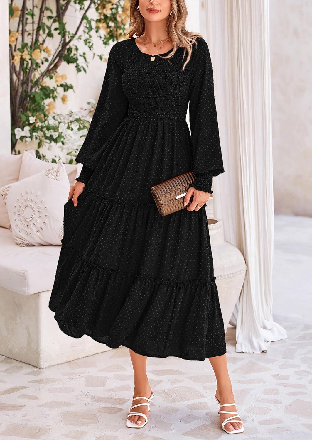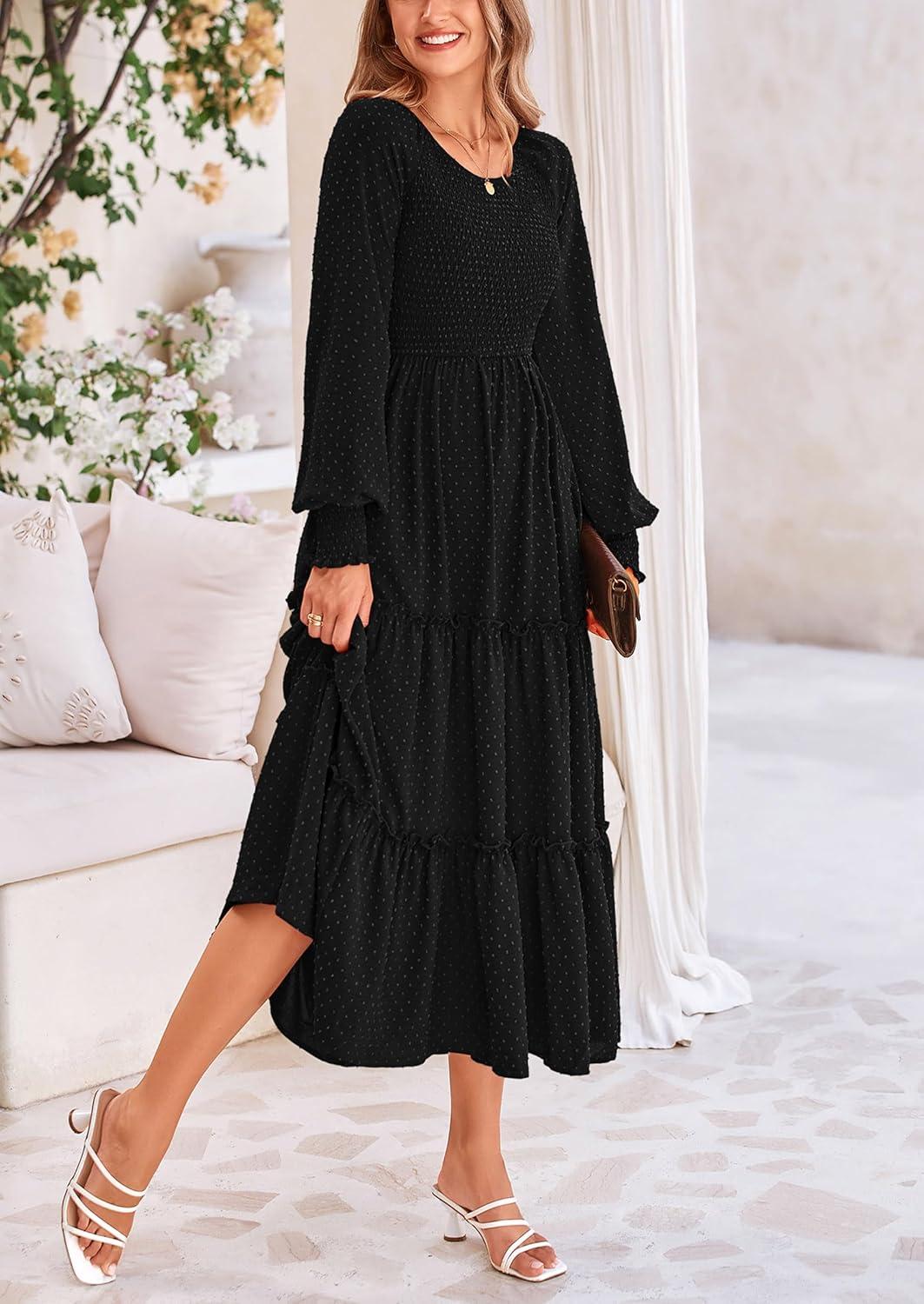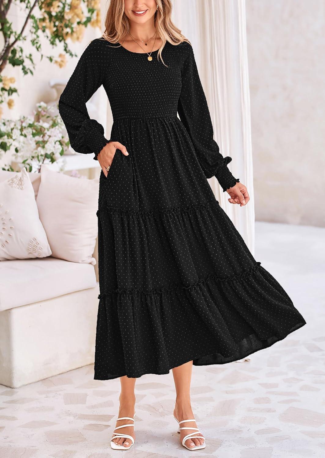 PRETTYGARDEN Women's Smocked Maxi Dress 2025 Fall Casual Long Sleeve Swiss Dot Ruffle Long Flowy Wedding Guest Dresses(Black)