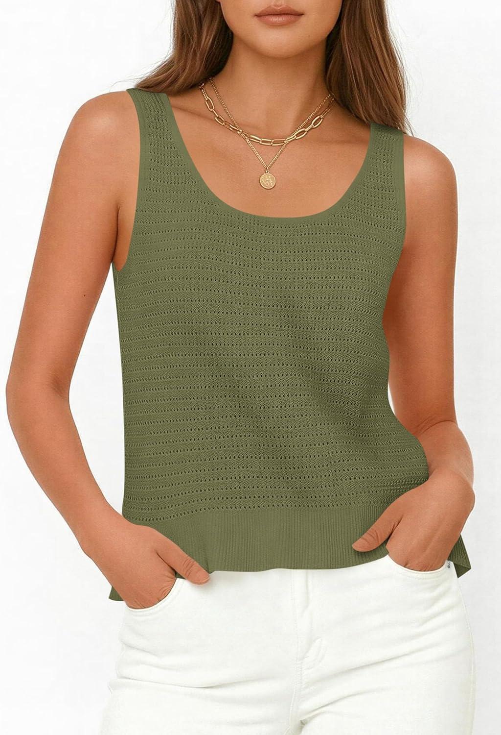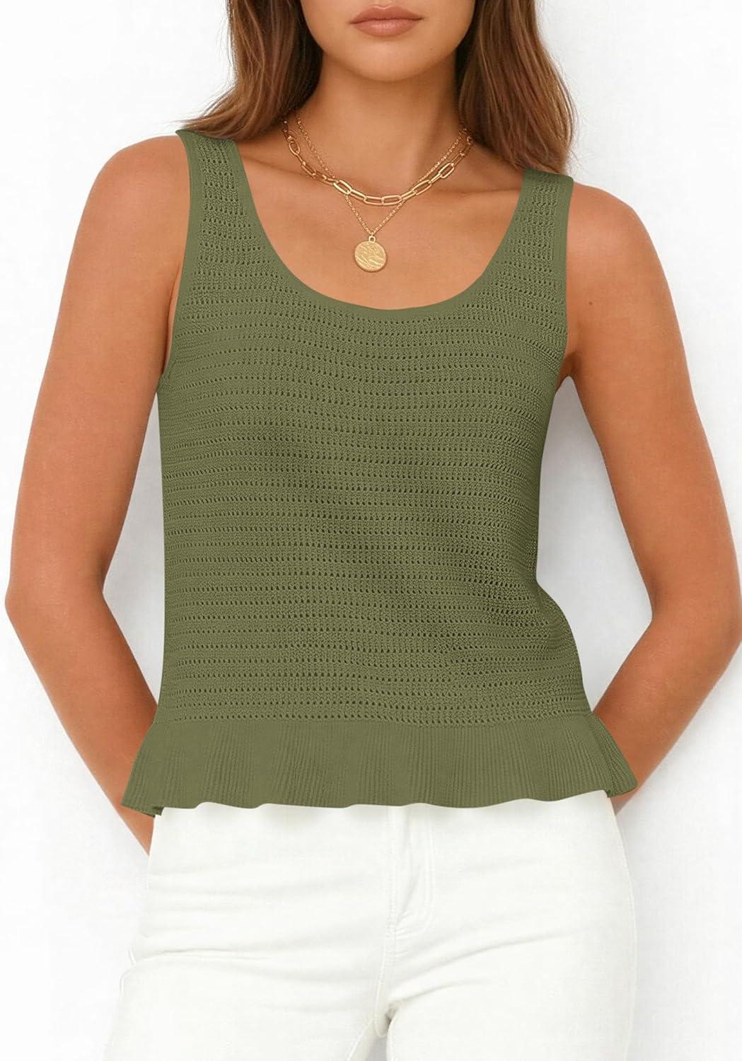 PRETTYGARDEN Womens Spring Crochet Tops 2026 Summer Sleeveless Scoop Neck Boho Sweater Tank Top Cute Beach Vacation Clothes(Army Green)
