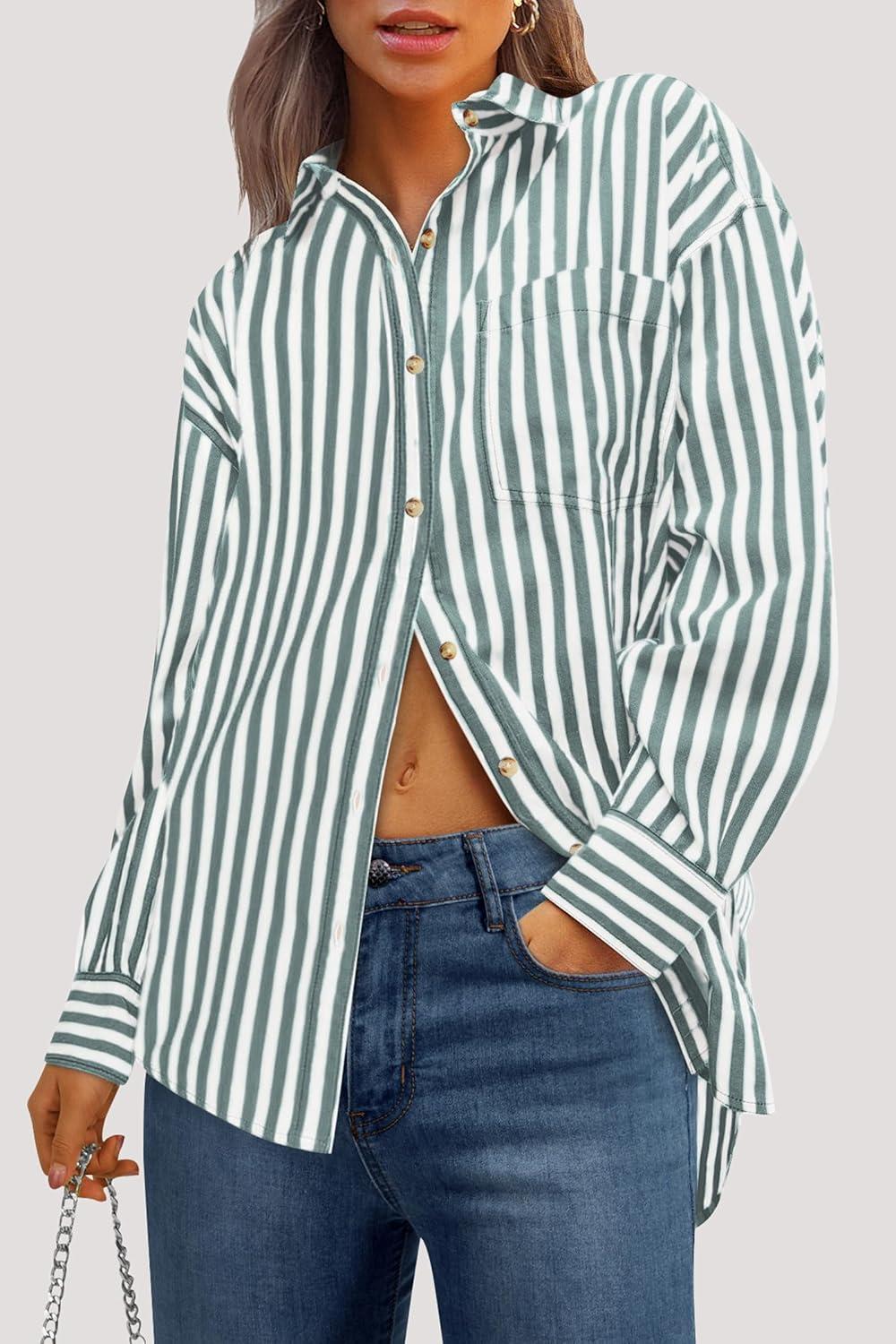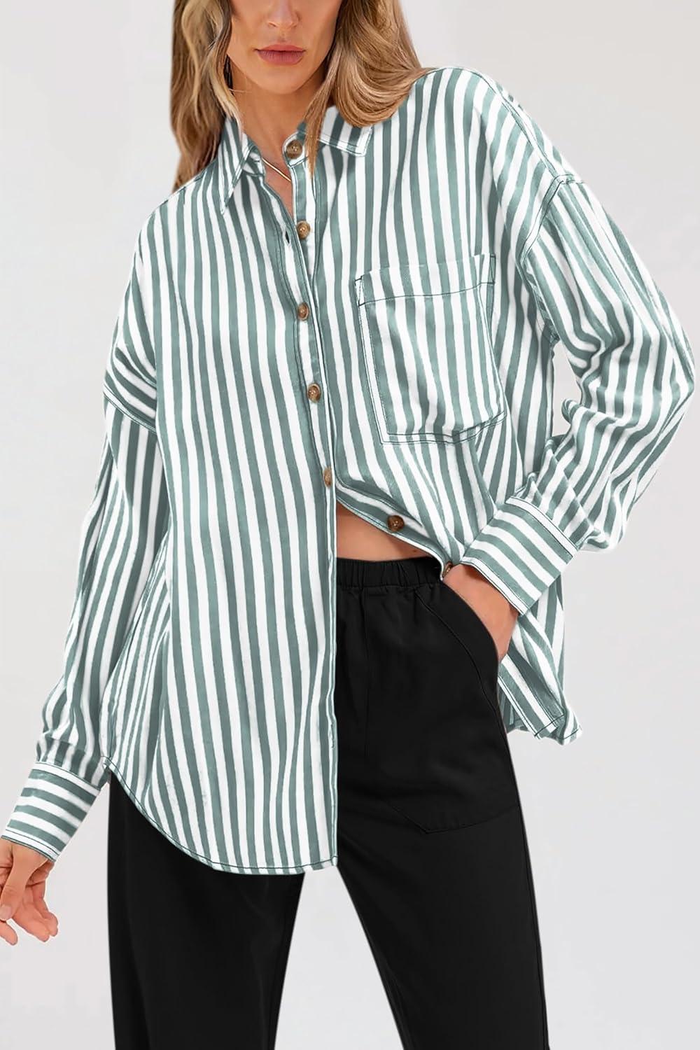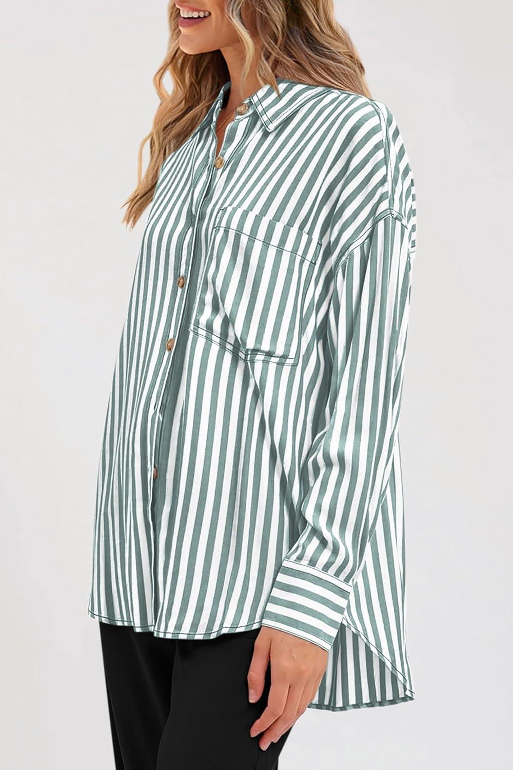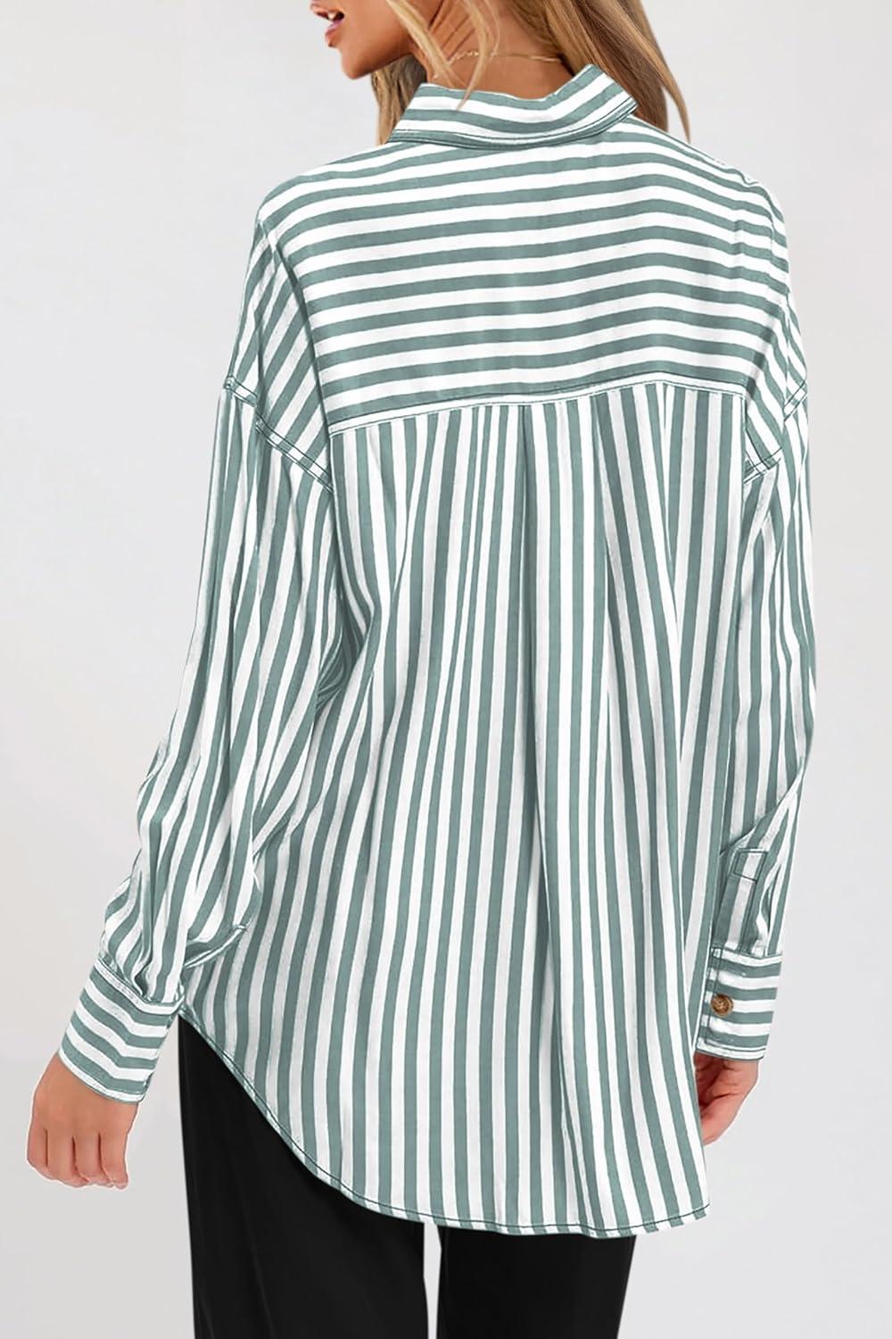 PRETTYGARDEN Womens Striped Button Down Shirt Spring 2025 Oversized Collared Long Sleeve Office Work Blouses Tops(Green)