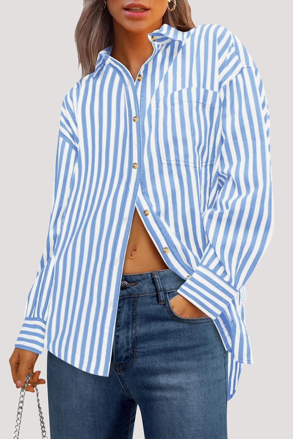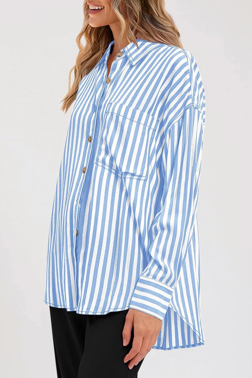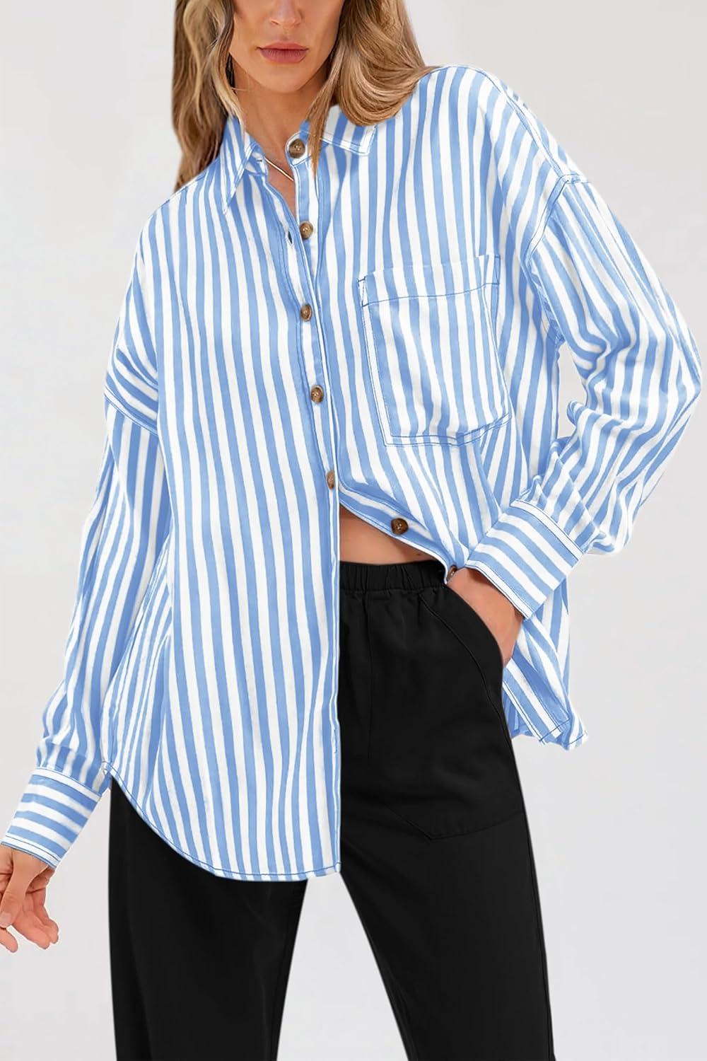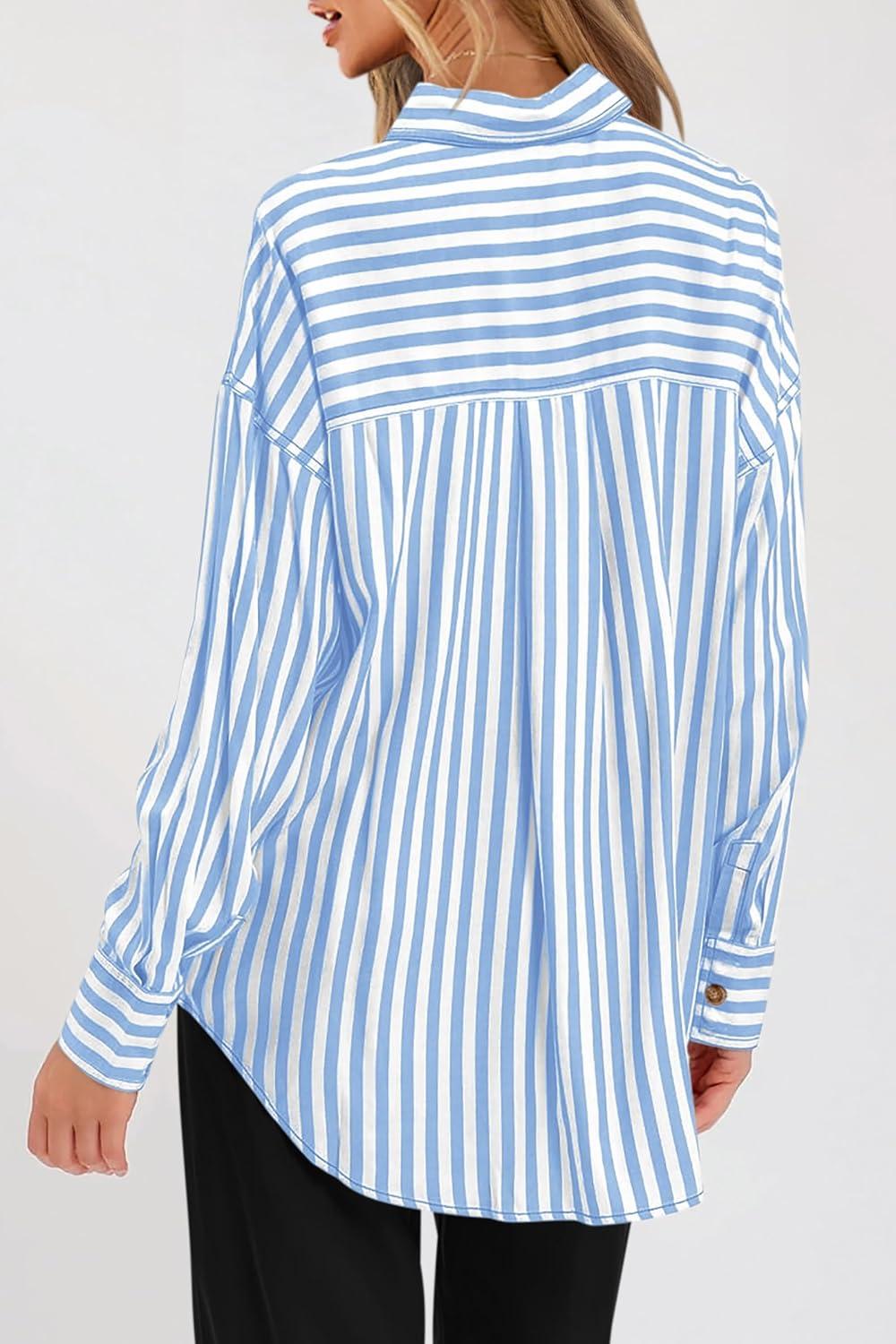 PRETTYGARDEN Womens Striped Button Down Shirt Spring 2025 Oversized Collared Long Sleeve Office Work Blouses Tops(Sky Blue)