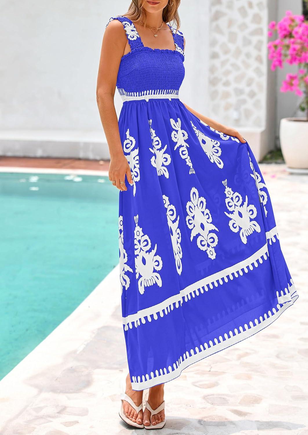 PRETTYGARDEN Womens Summer Boho Maxi Dress 2025 Casual Sleeveless Square Neck Floral Aline Smocked Beach Dresses with Pockets(Floral Royal Blue White)
