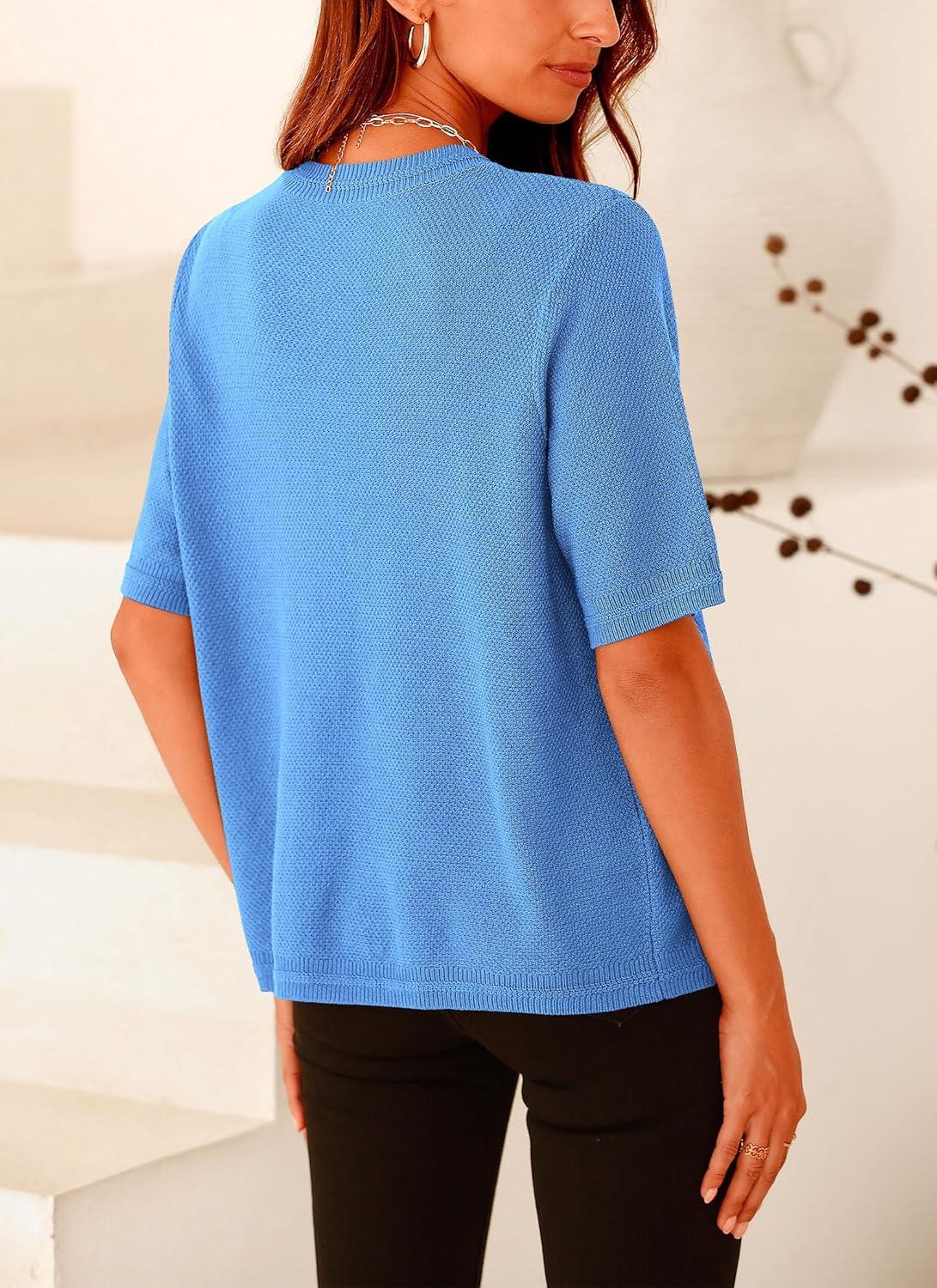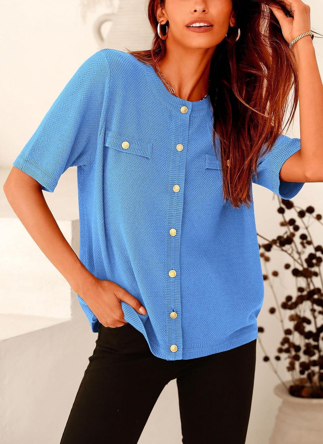 PRETTYGARDEN Women's Summer Button Down Shirts Casual Short Sleeve Crew Neck Ribbed Knit Blouse Top Cardigans(Blue)