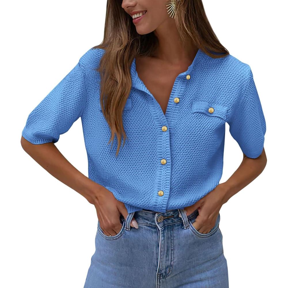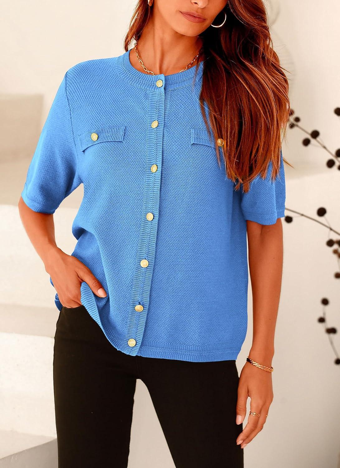 PRETTYGARDEN Women’s Summer Button Down Shirts Casual Short Sleeve Crew Neck Ribbed Knit Blouse Top Cardigans(Blue)