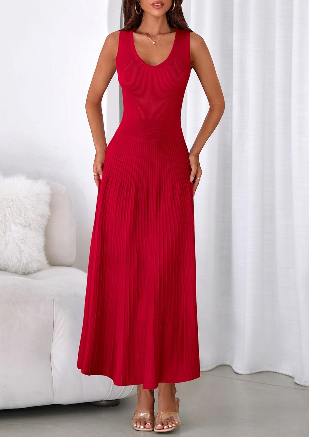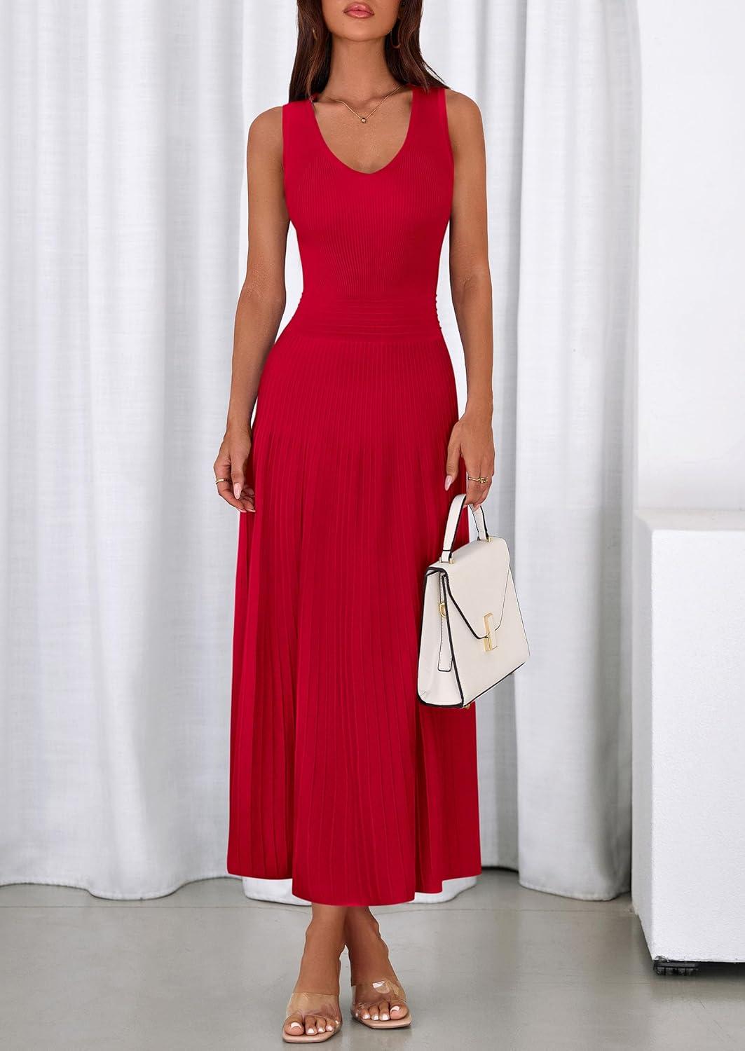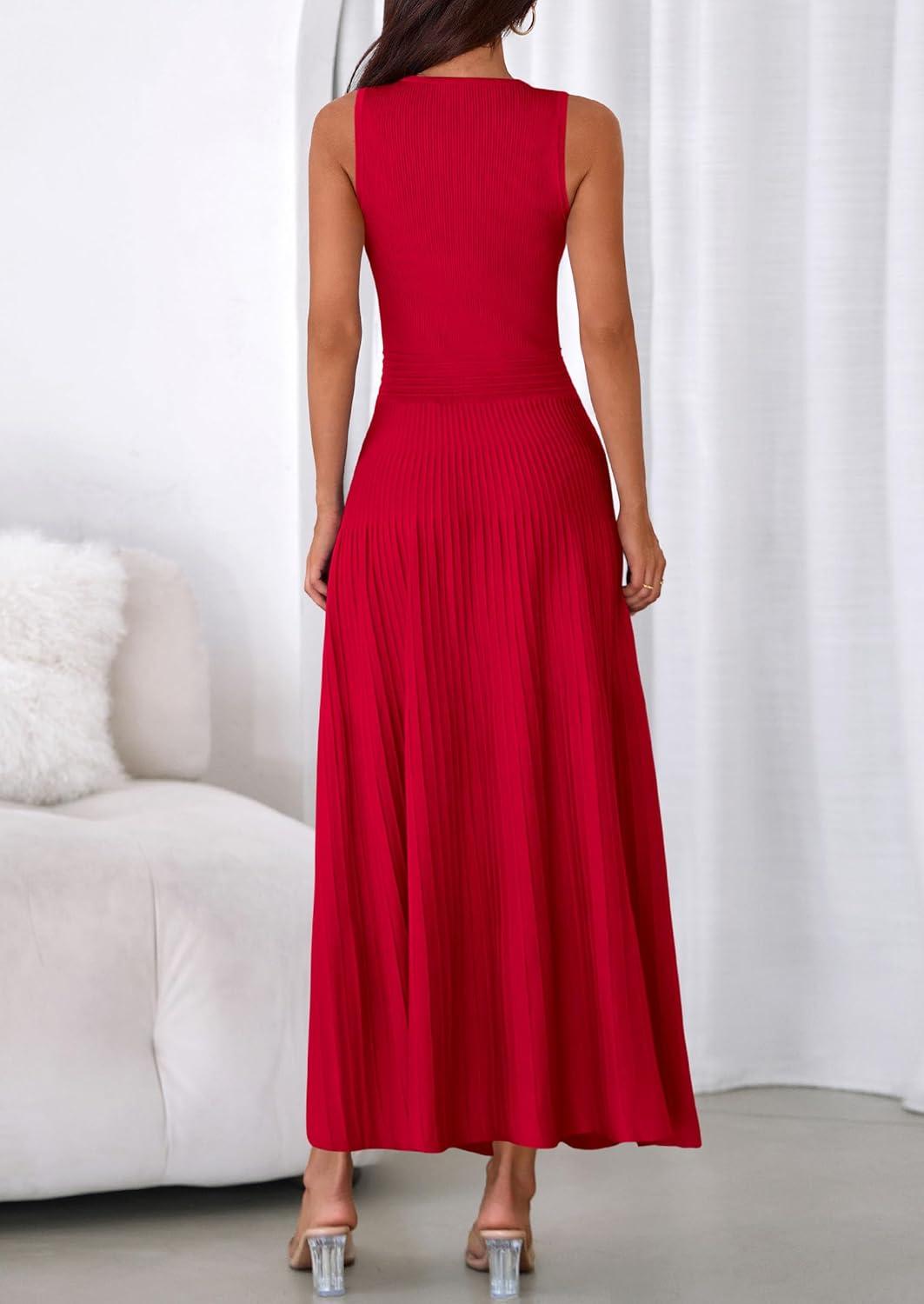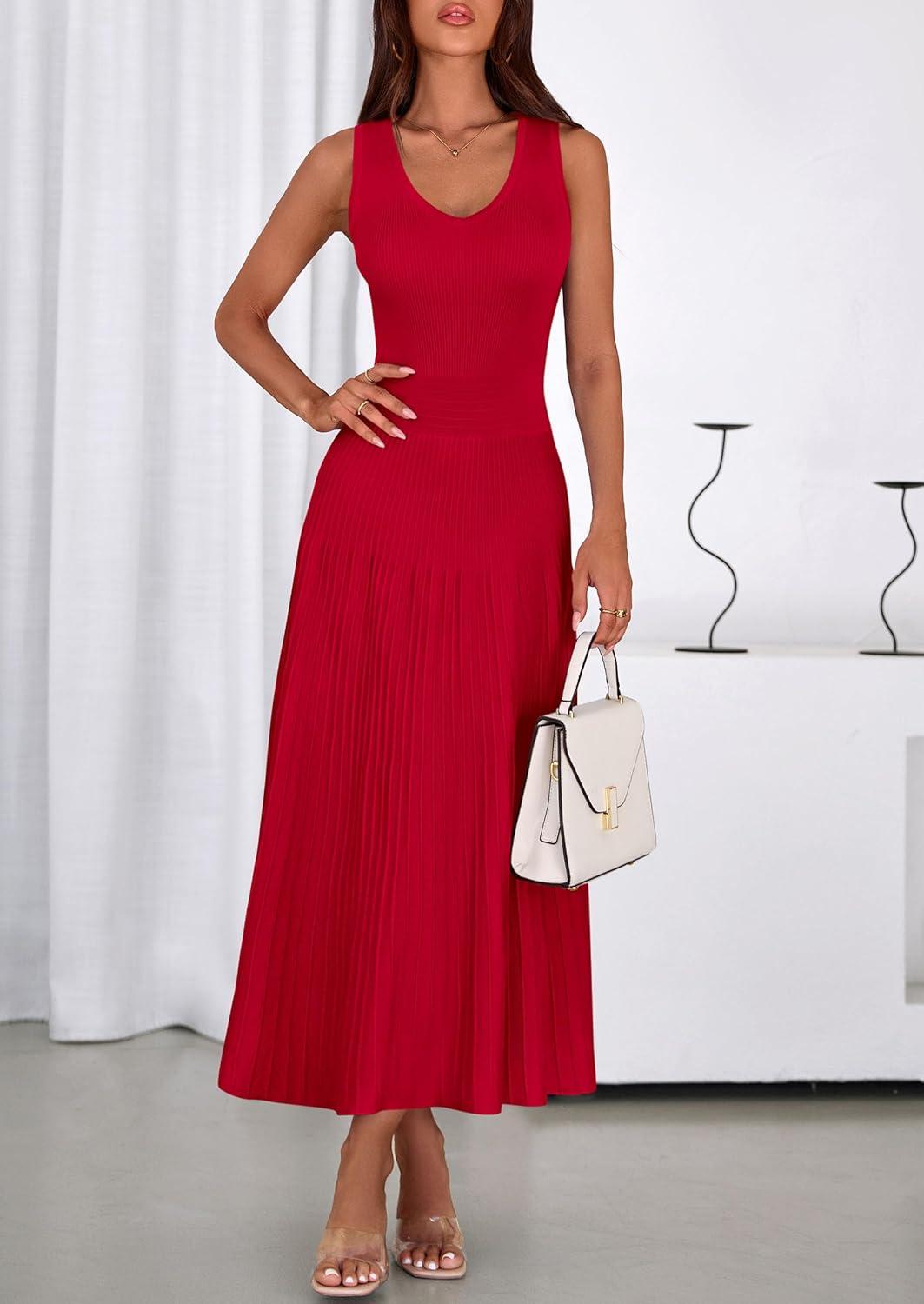 PRETTYGARDEN Women's Summer Casual Dresses 2026 Spring Sleeveless V Neck Midi Business Work A Line Pleated Cocktail Dress(Red)