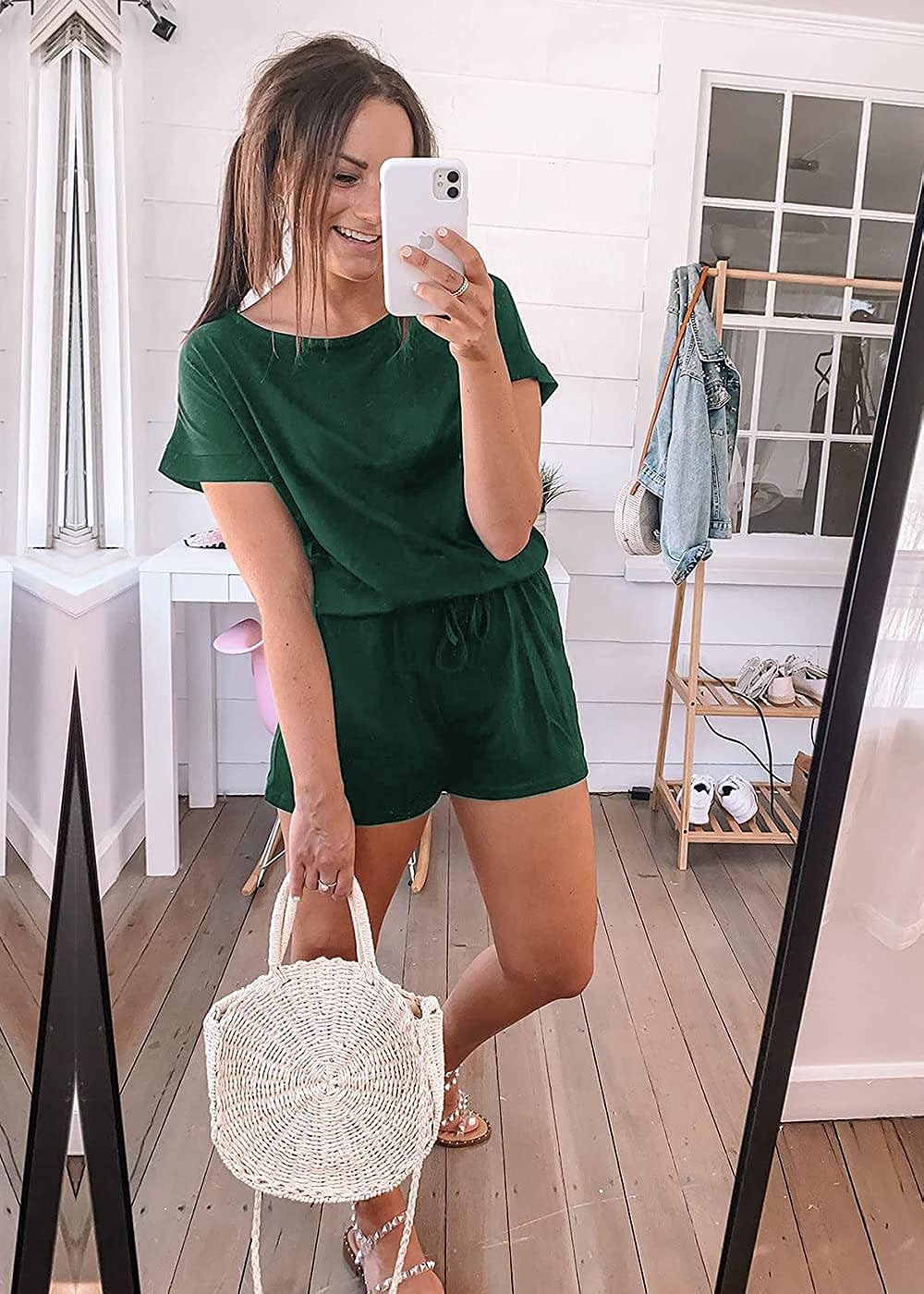 PRETTYGARDEN Women’s Summer Casual Off Shoulder Rompers Short Sleeve Loose One Piece Jumpsuit with Pockets(Dark Green)