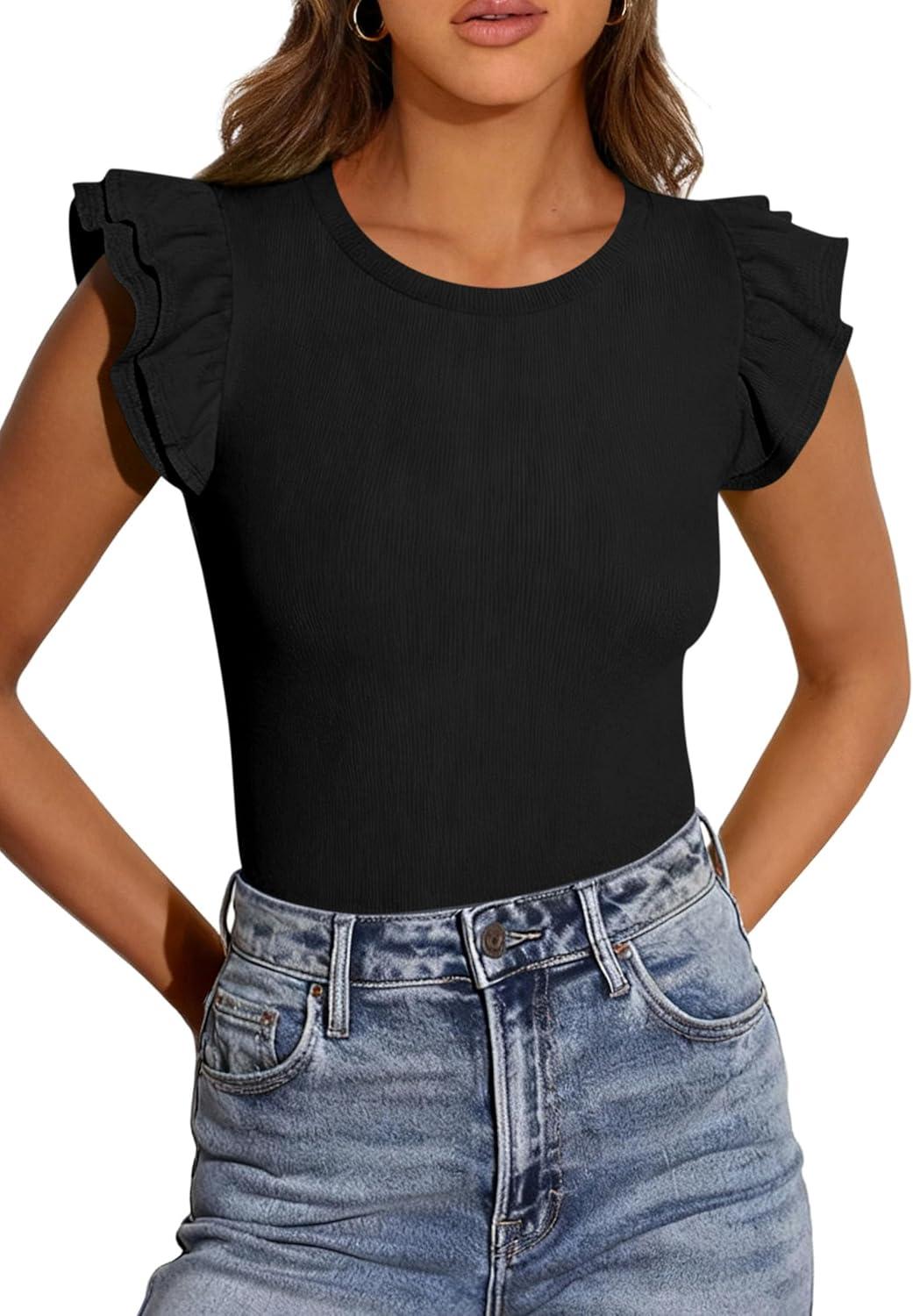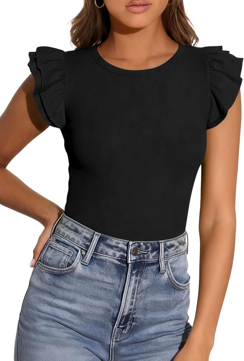 PRETTYGARDEN Womens Summer Crew Neck T Shirts 2026 Trendy Ruffle Sleeve Slim Fit Knit Going Out Tops Casual Spring Clothes(Black)