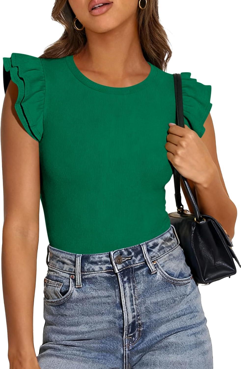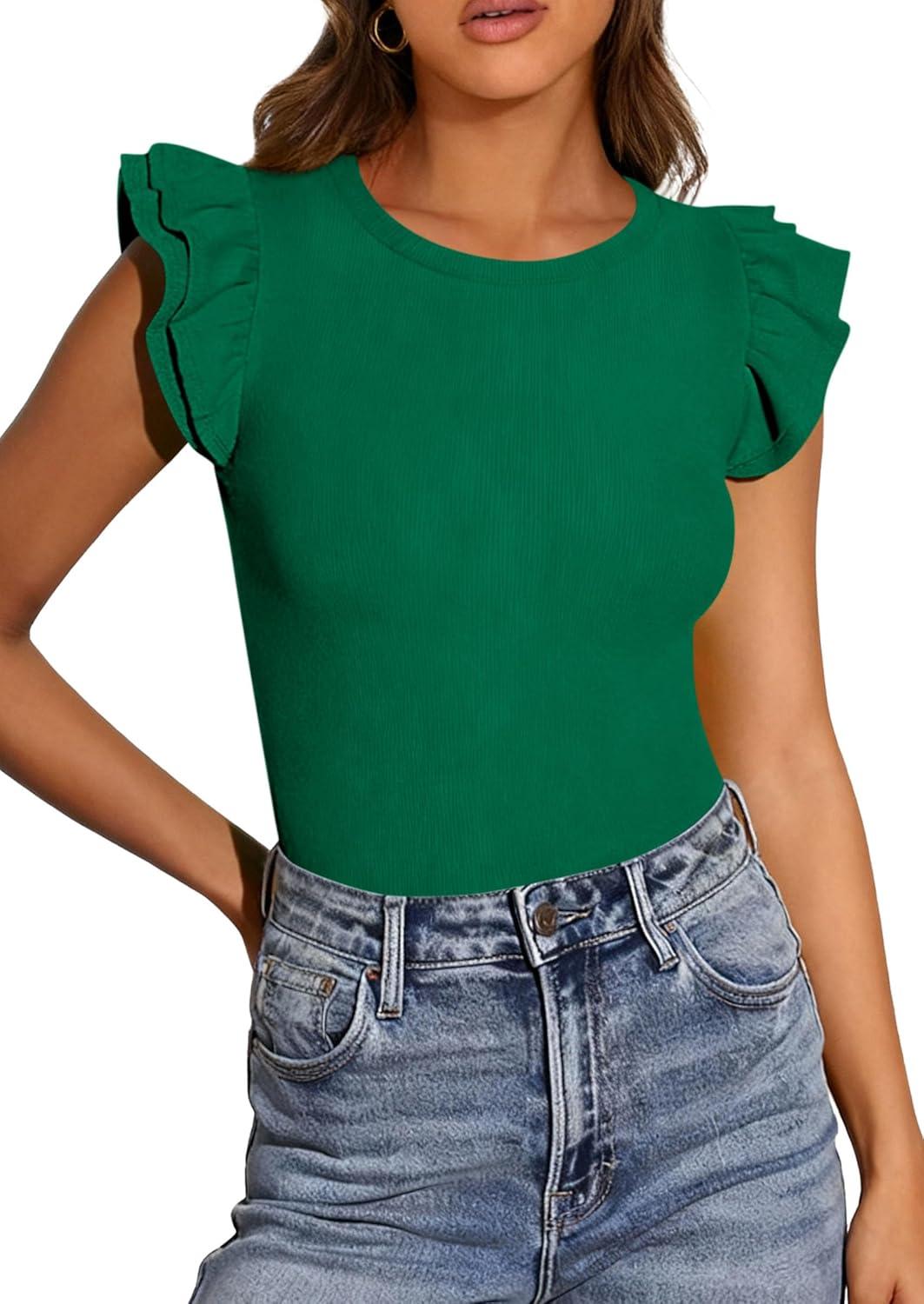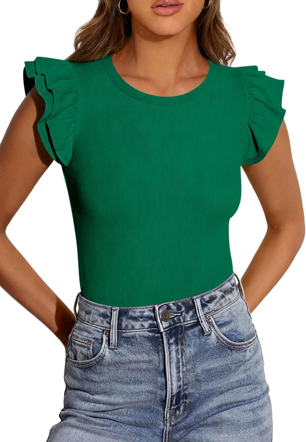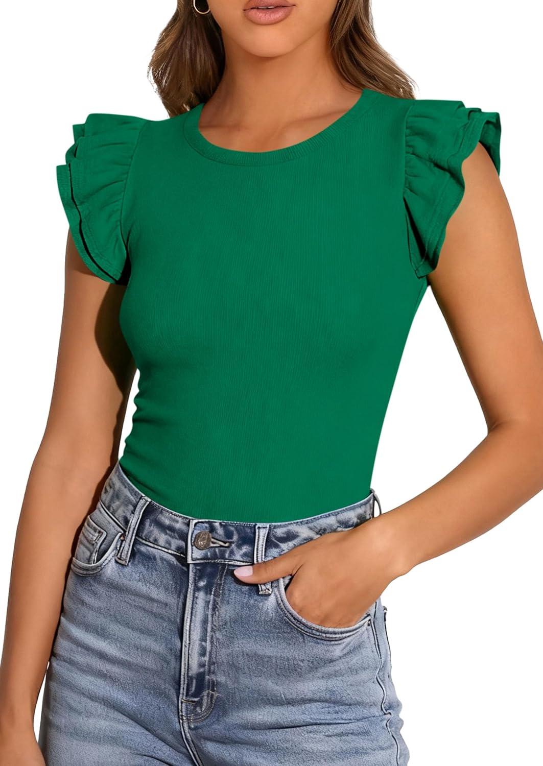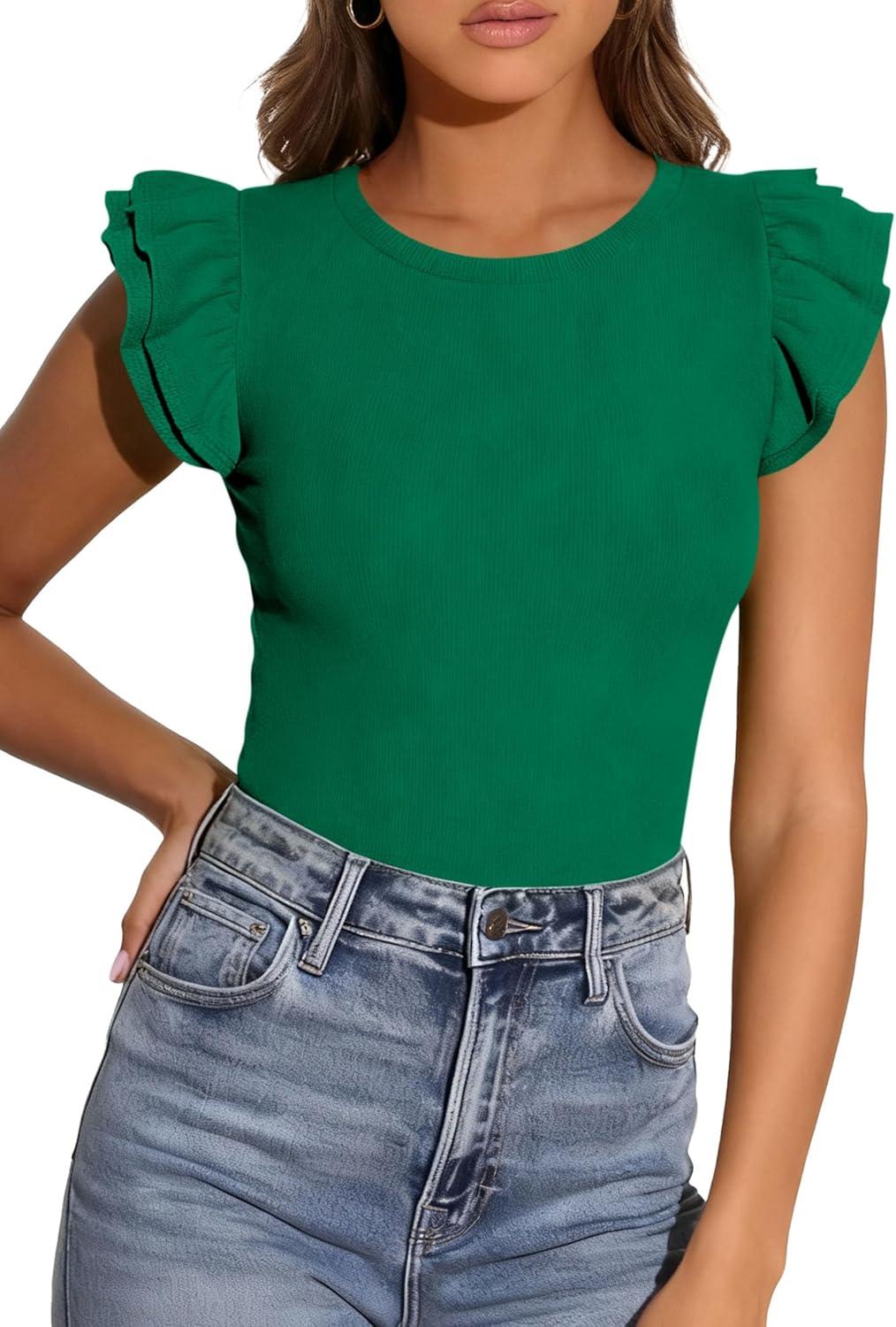 PRETTYGARDEN Womens Summer Crew Neck T Shirts 2026 Trendy Ruffle Sleeve Slim Fit Knit Going Out Tops Casual Spring Clothes(Green)