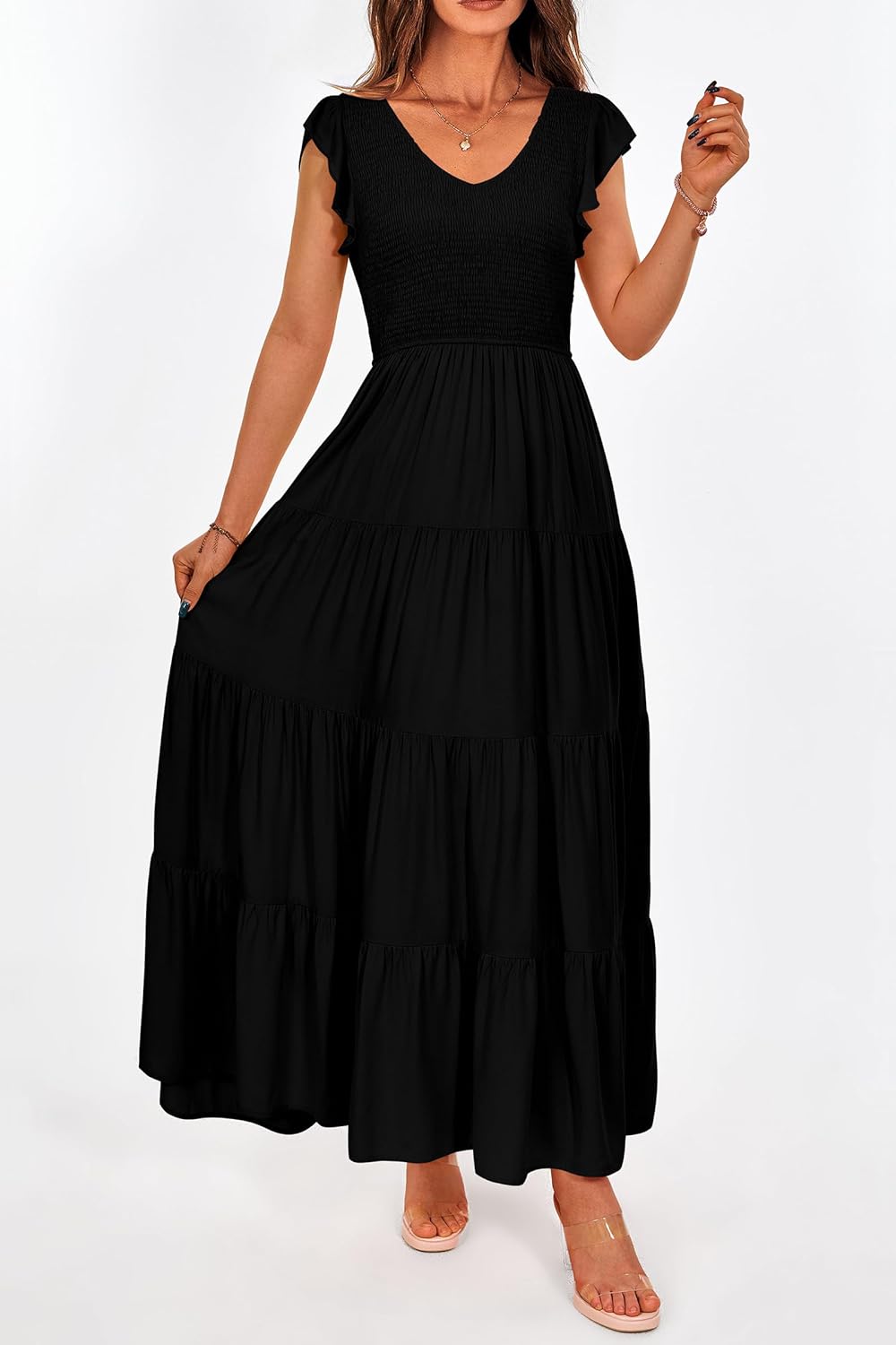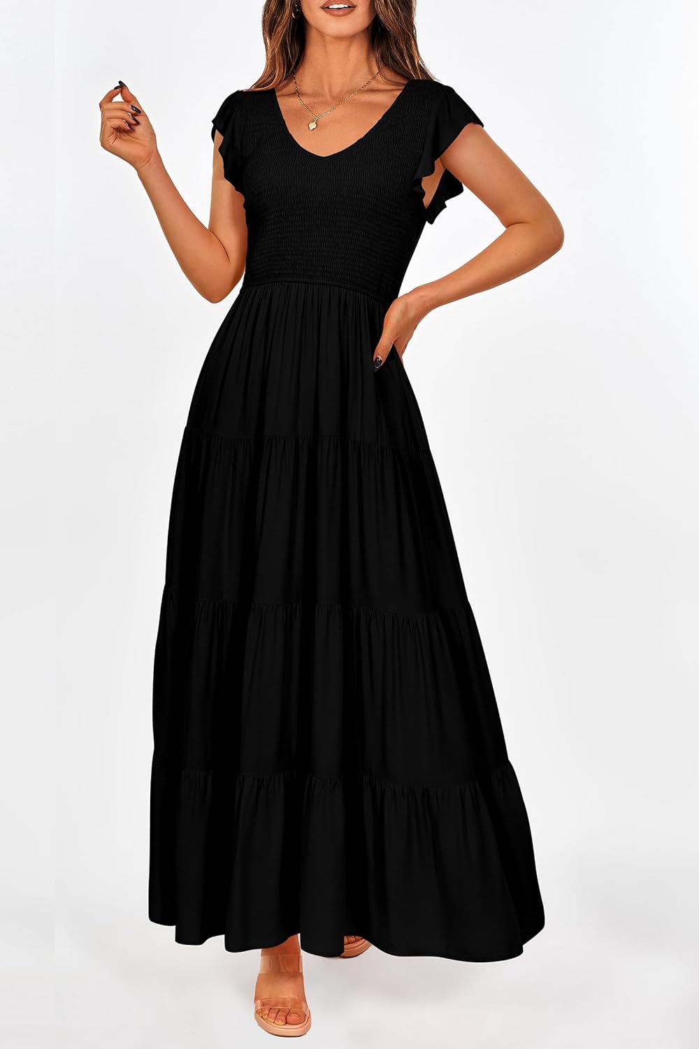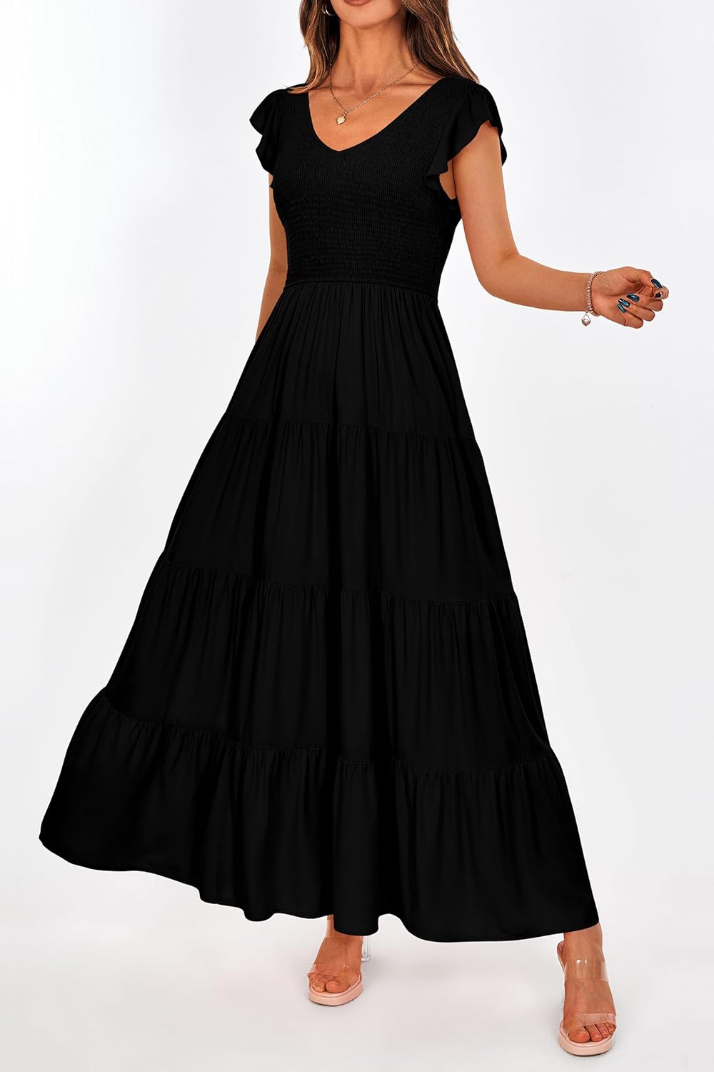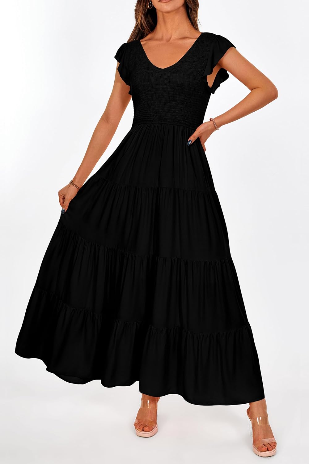 PRETTYGARDEN Women's Summer Flowy Maxi Dress Casual Cap Sleeve V Neck Smocked Beach Sundress(Solid Black)