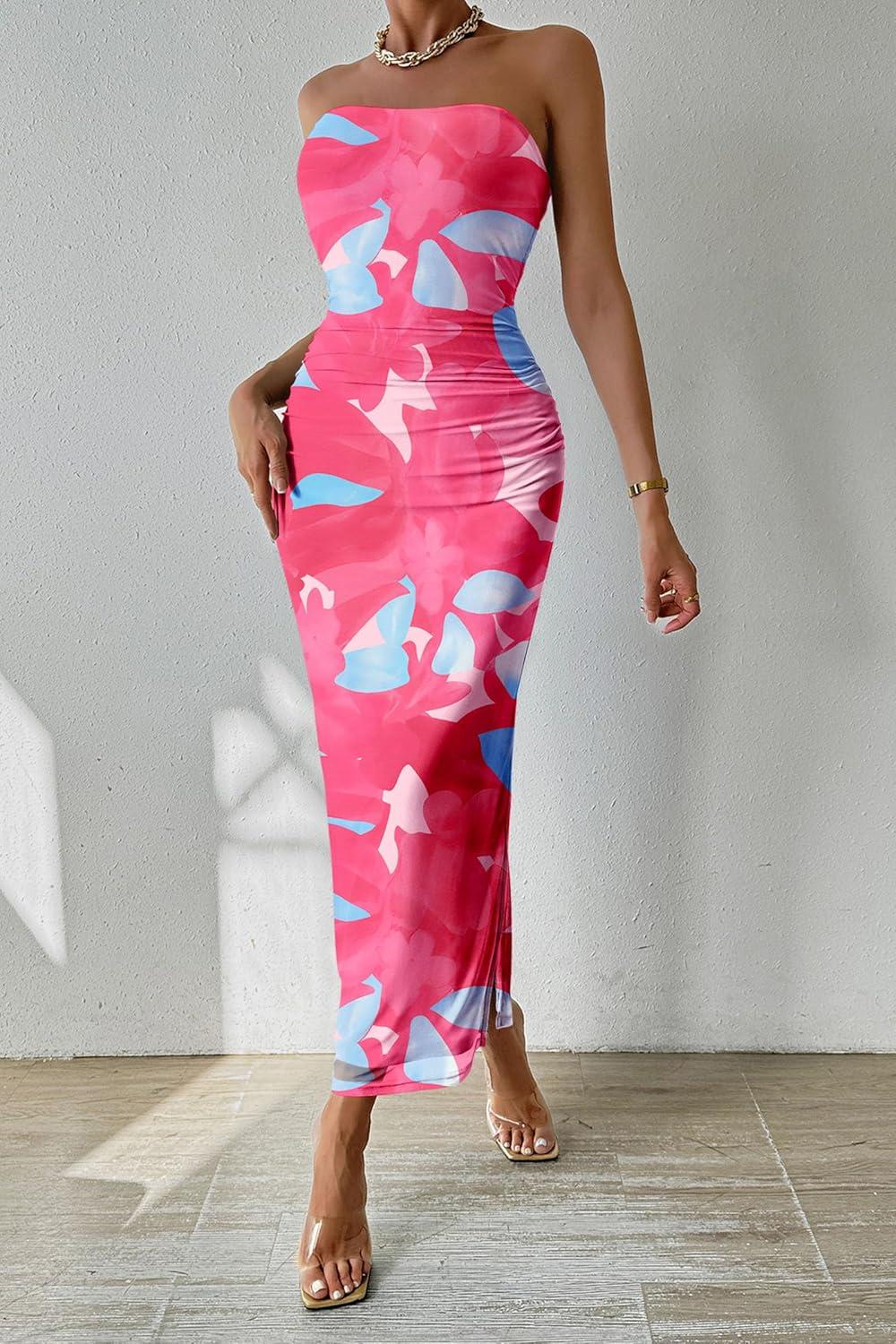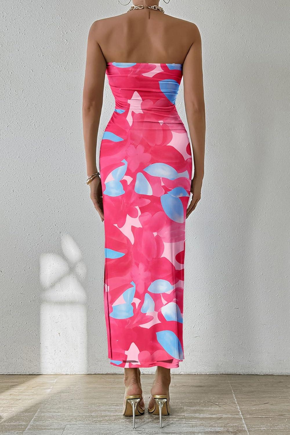 PRETTYGARDEN Women's Summer Maxi Bodycon Dresses Strapless Tube Top Slit Floral Printed Party Club Long Dress(Floral Rose Red)