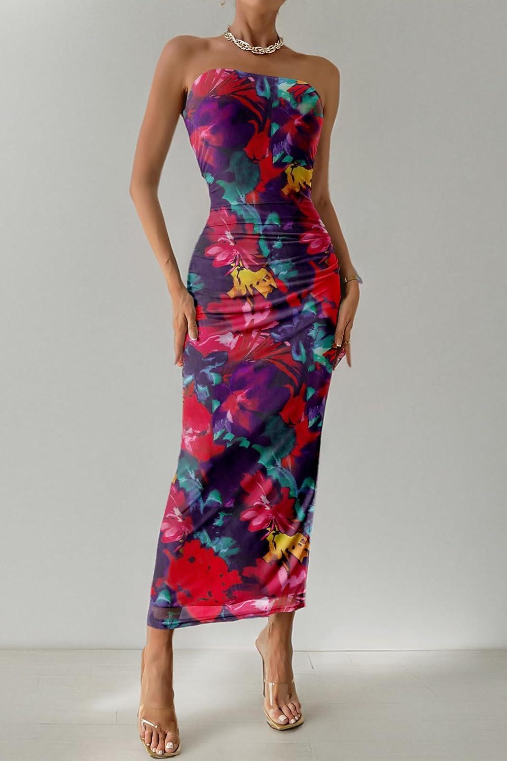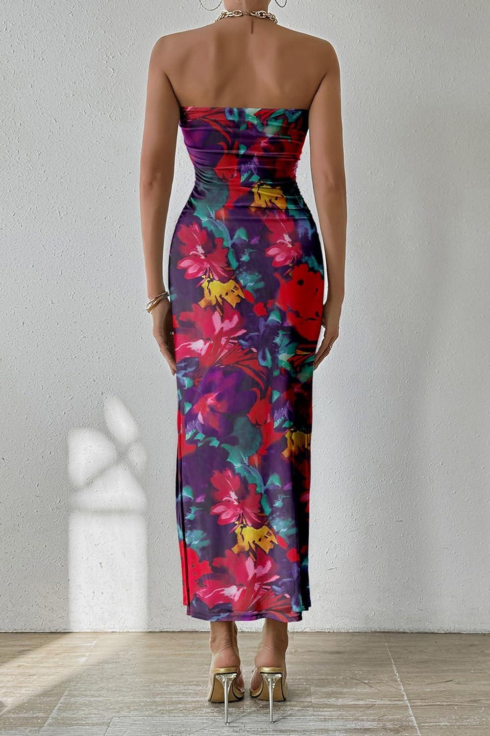 PRETTYGARDEN Women’s Summer Maxi Bodycon Dresses Strapless Tube Top Slit Floral Printed Party Club Long Dress(Green Big Floral)