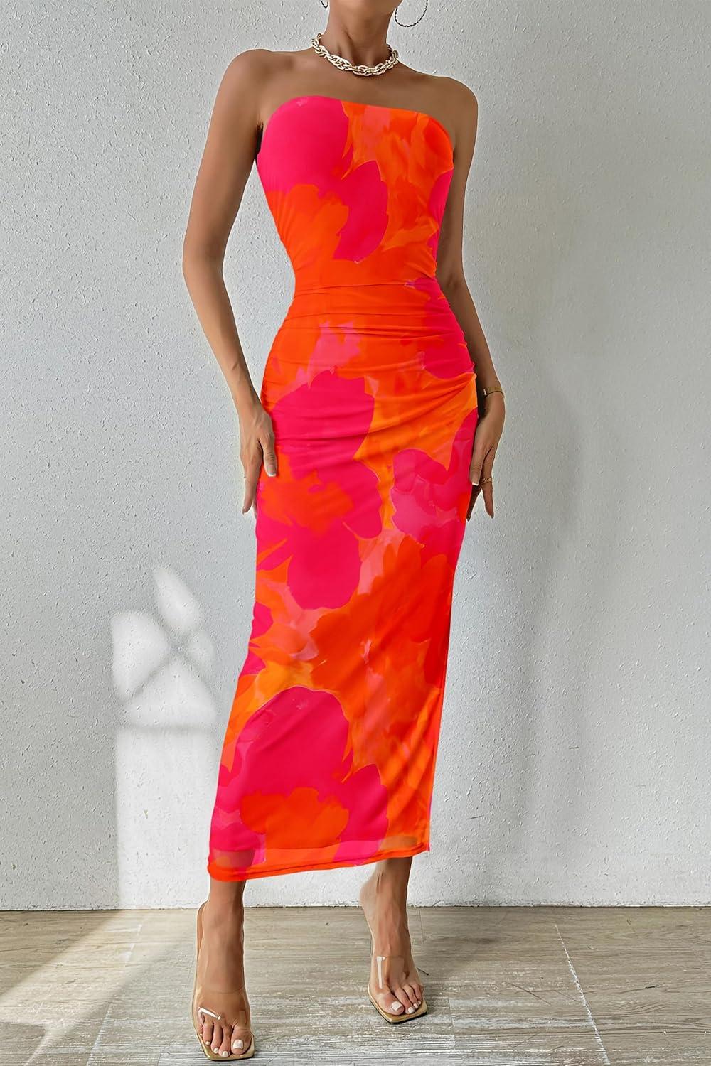 PRETTYGARDEN Women's Summer Maxi Bodycon Dresses Strapless Tube Top Slit Floral Printed Party Club Long Dress(Orange Red Big Floral)