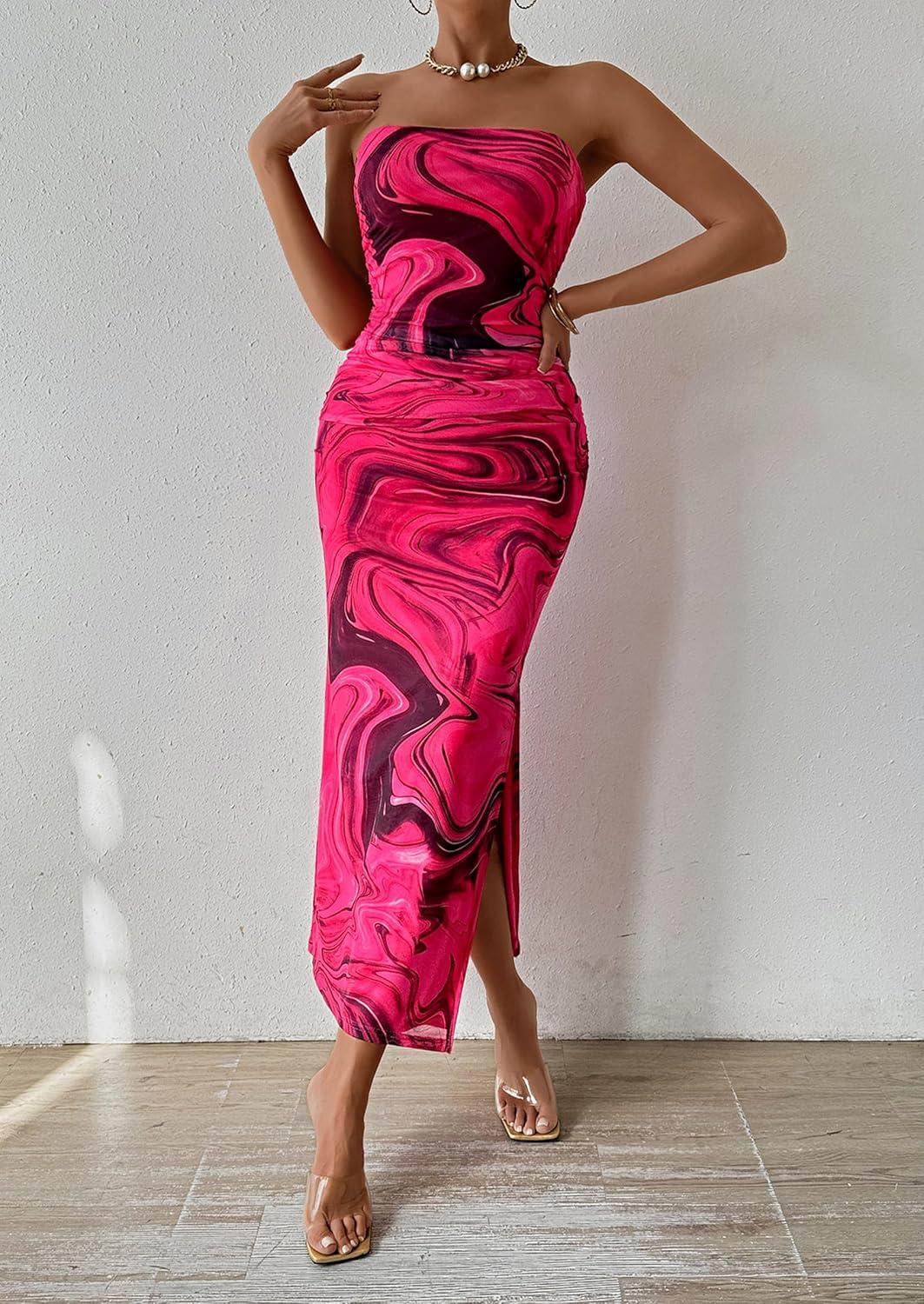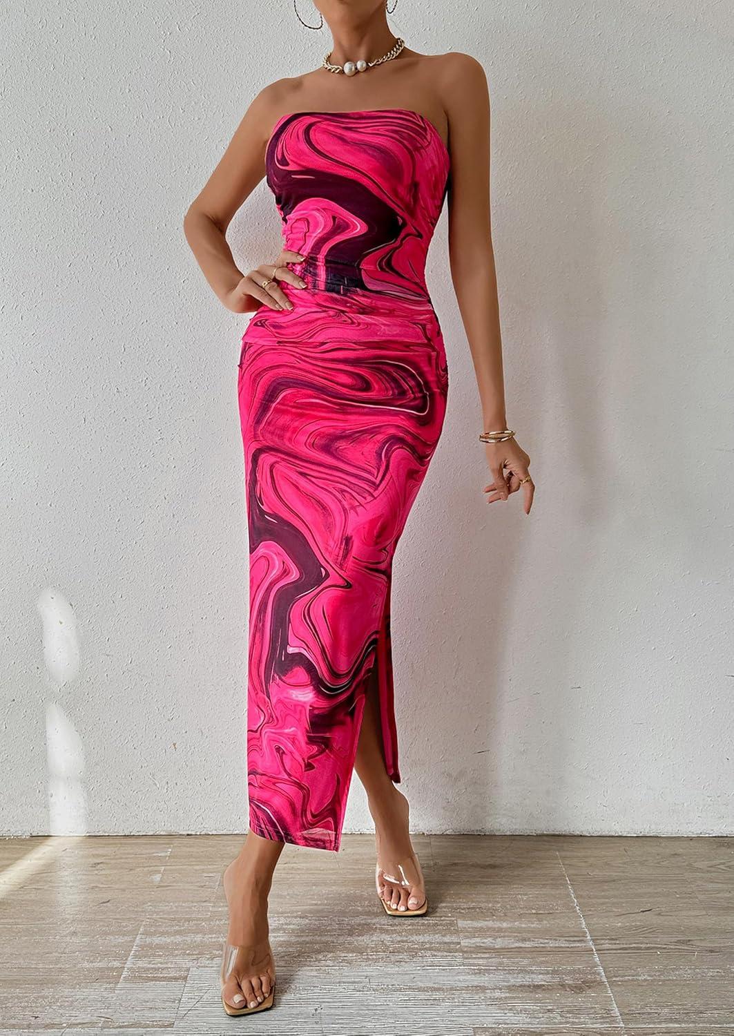 PRETTYGARDEN Women’s Summer Maxi Bodycon Dresses Strapless Tube Top Slit Floral Printed Party Club Long Dress(Print Pink)