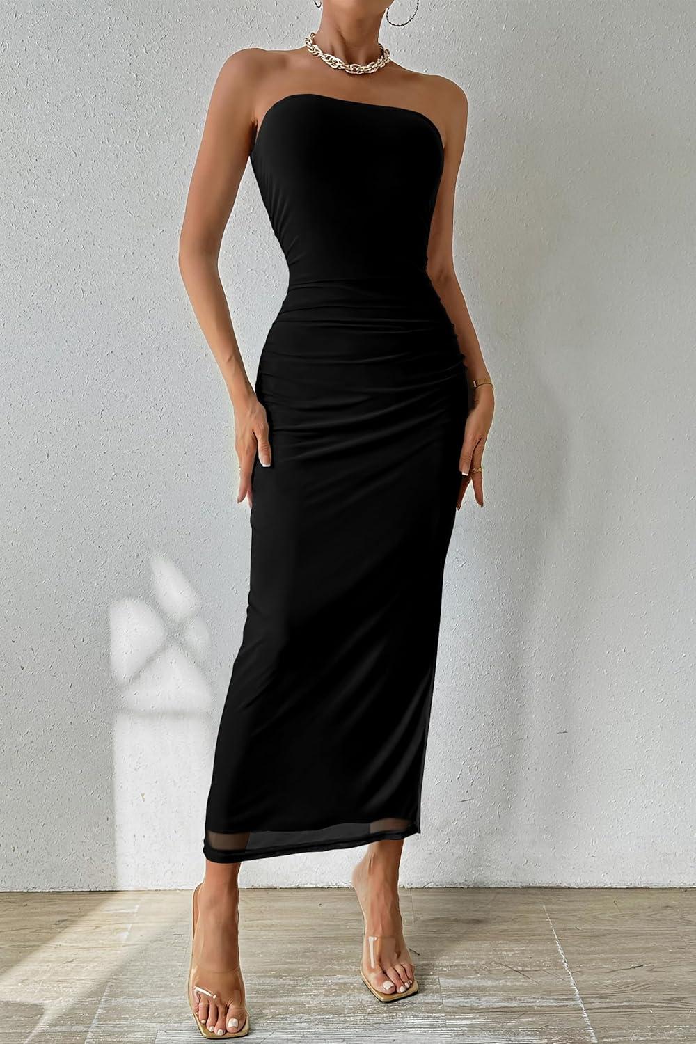 PRETTYGARDEN Women's Summer Maxi Bodycon Dresses Strapless Tube Top Slit Floral Printed Party Club Long Dress(Solid Black)