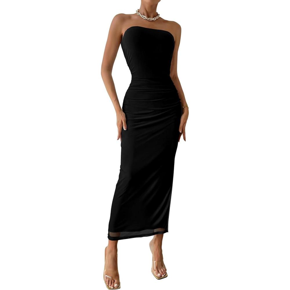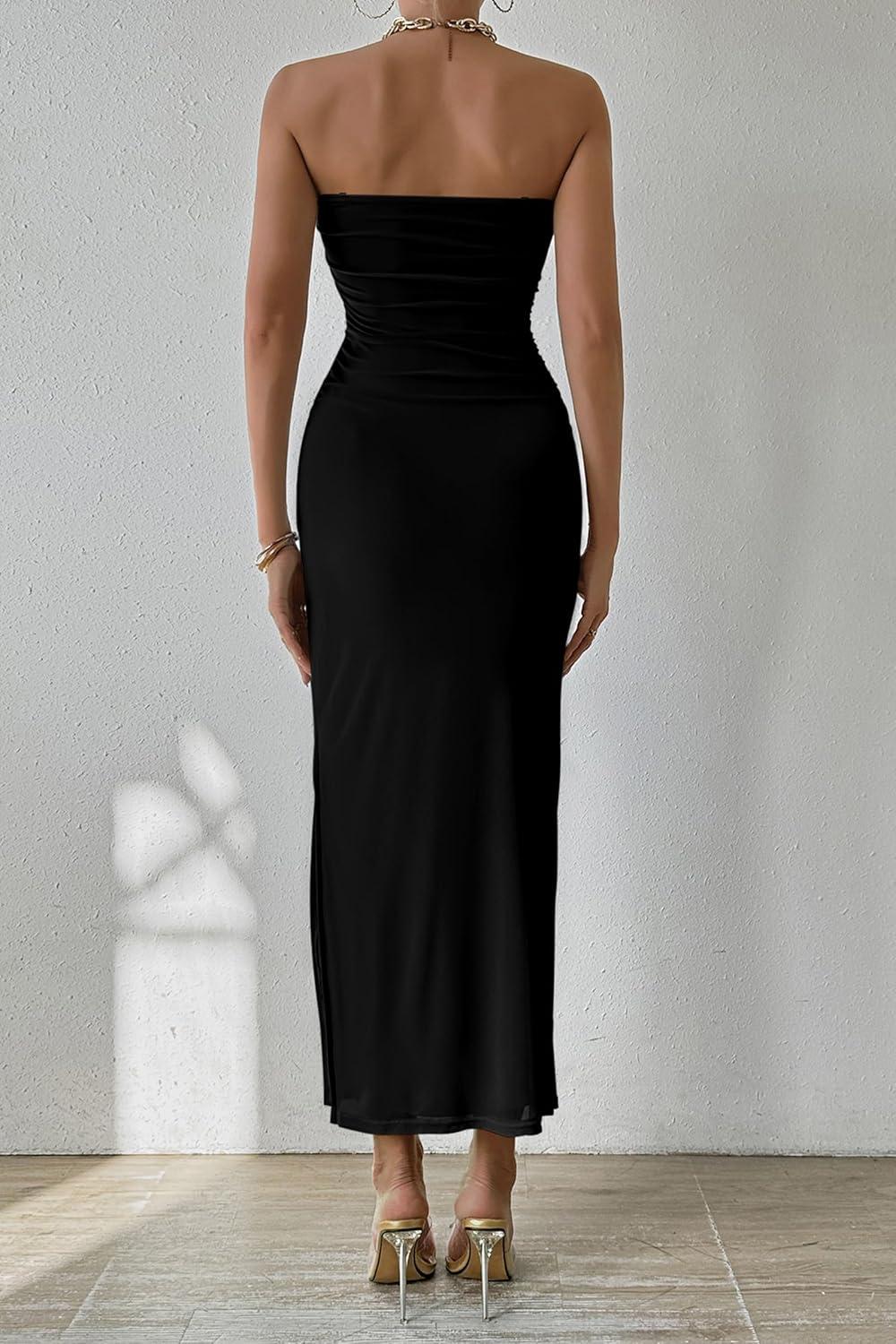 PRETTYGARDEN Women’s Summer Maxi Bodycon Dresses Strapless Tube Top Slit Floral Printed Party Club Long Dress(Solid Black)