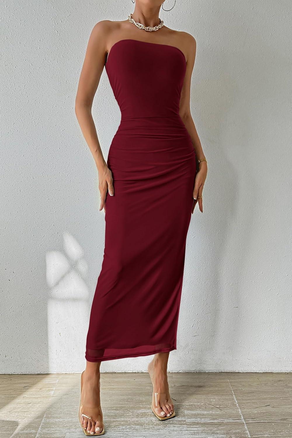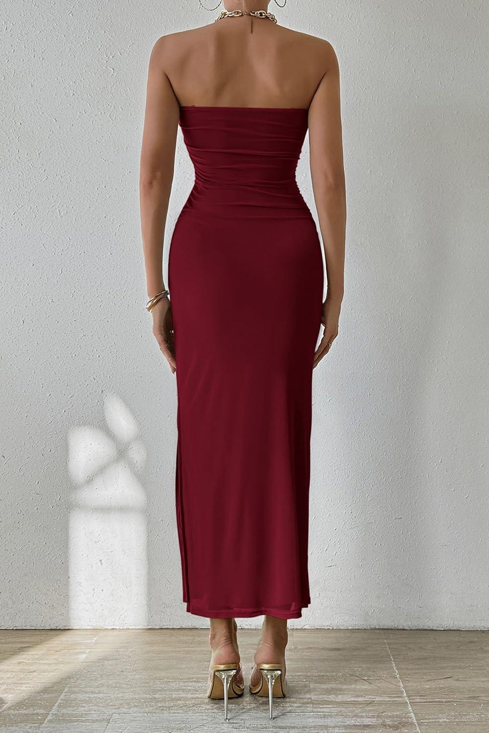 PRETTYGARDEN Women's Summer Maxi Bodycon Dresses Strapless Tube Top Slit Floral Printed Party Club Long Dress(Solid Wine Red)