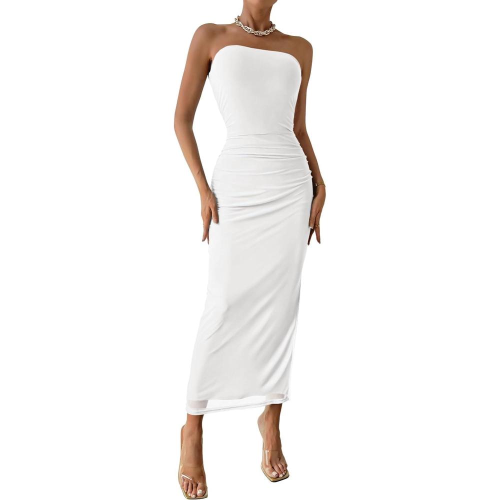 imagePRETTYGARDEN Womens Summer Maxi Bodycon Dresses Strapless Tube Top Slit Floral Printed Party Club Long DressWhite