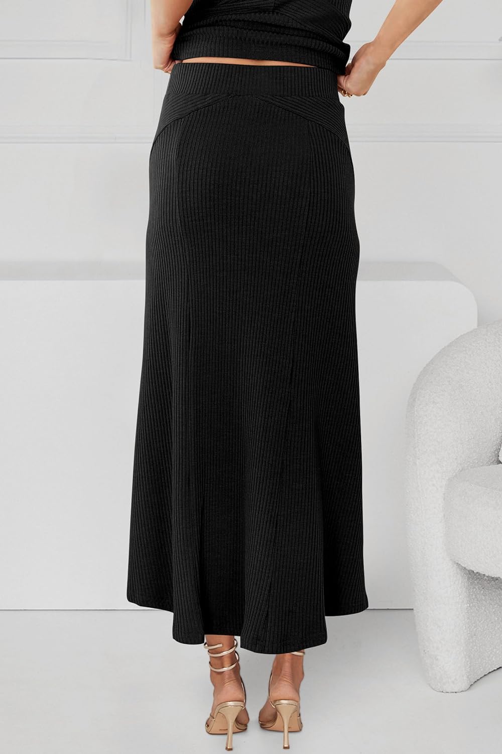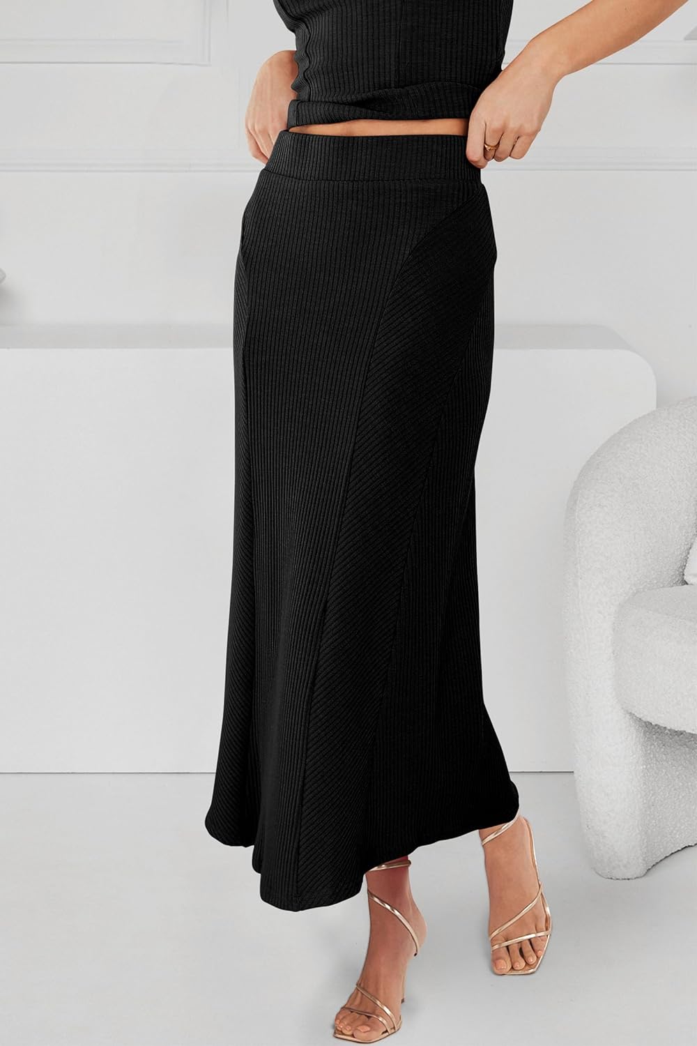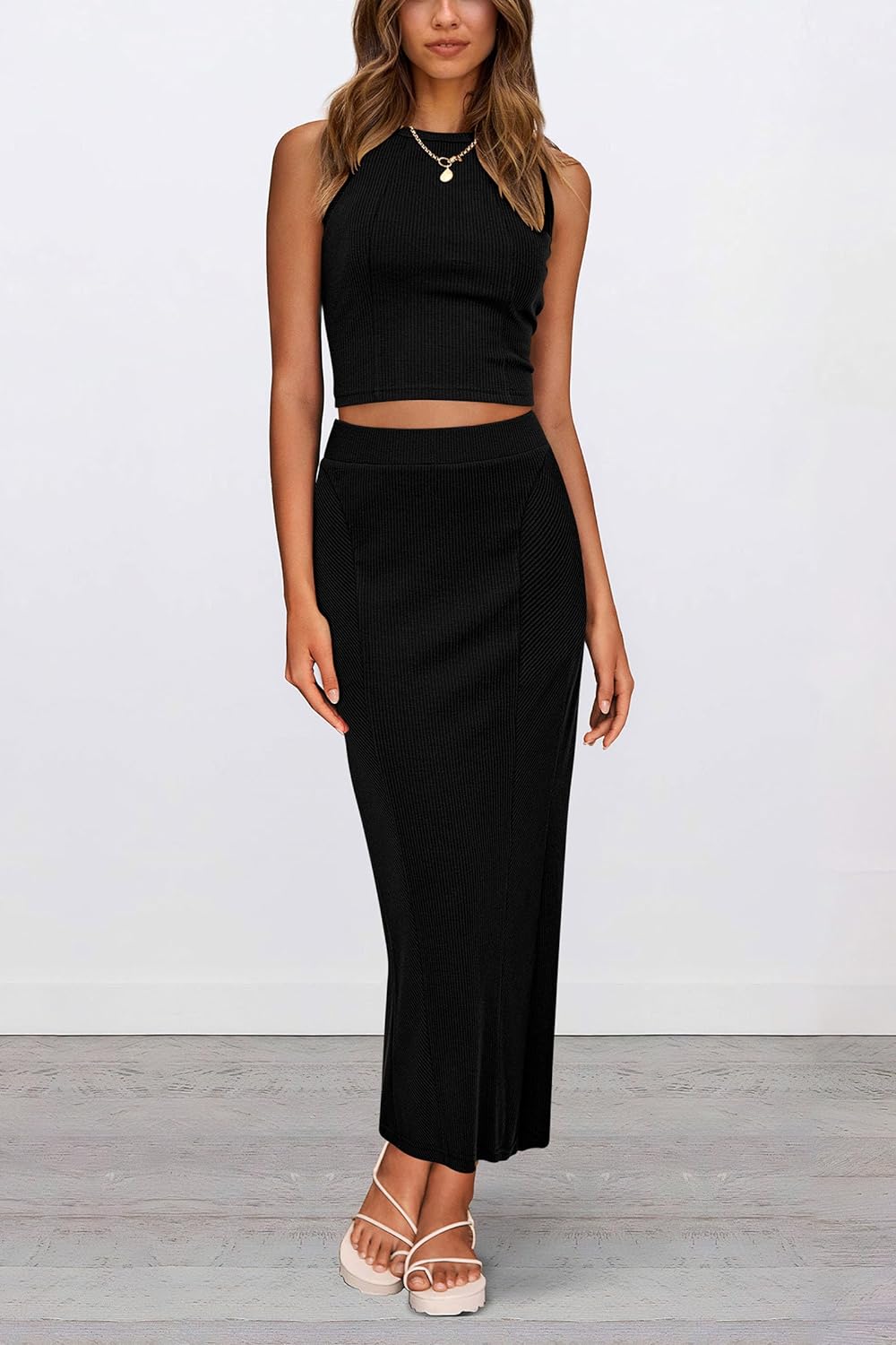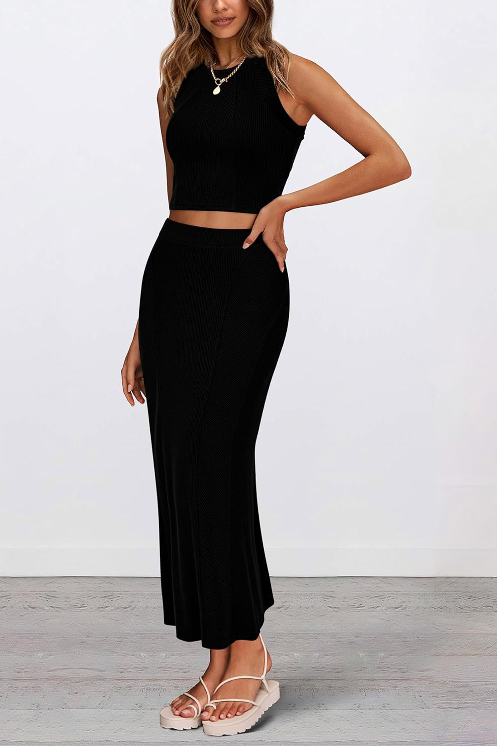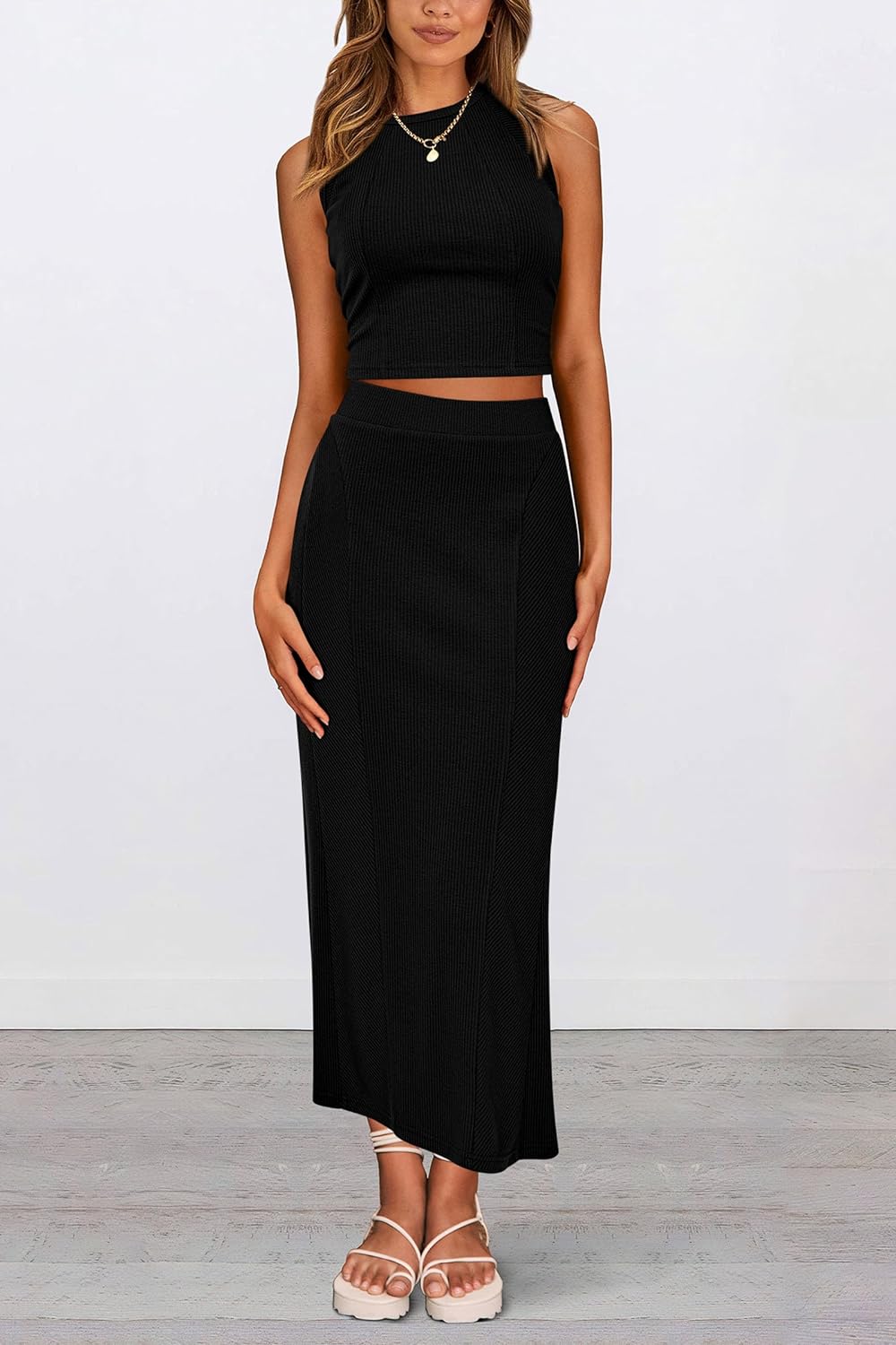 PRETTYGARDEN Womens Summer Two Piece Outfits Ribbed Crewneck Sleeveless Cropped Tank Tops and Bodycon Midi Skirt Matching Set(Black)