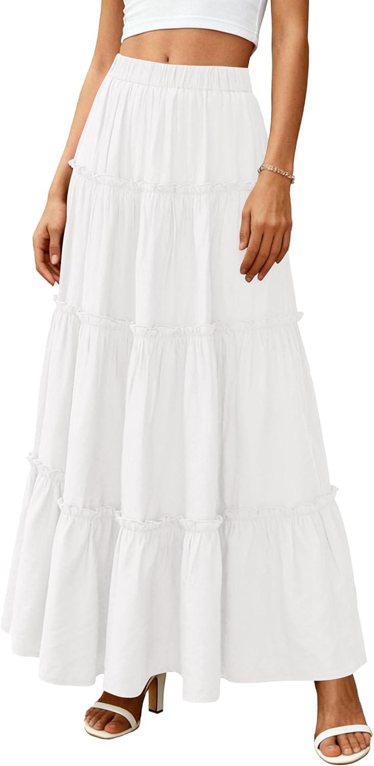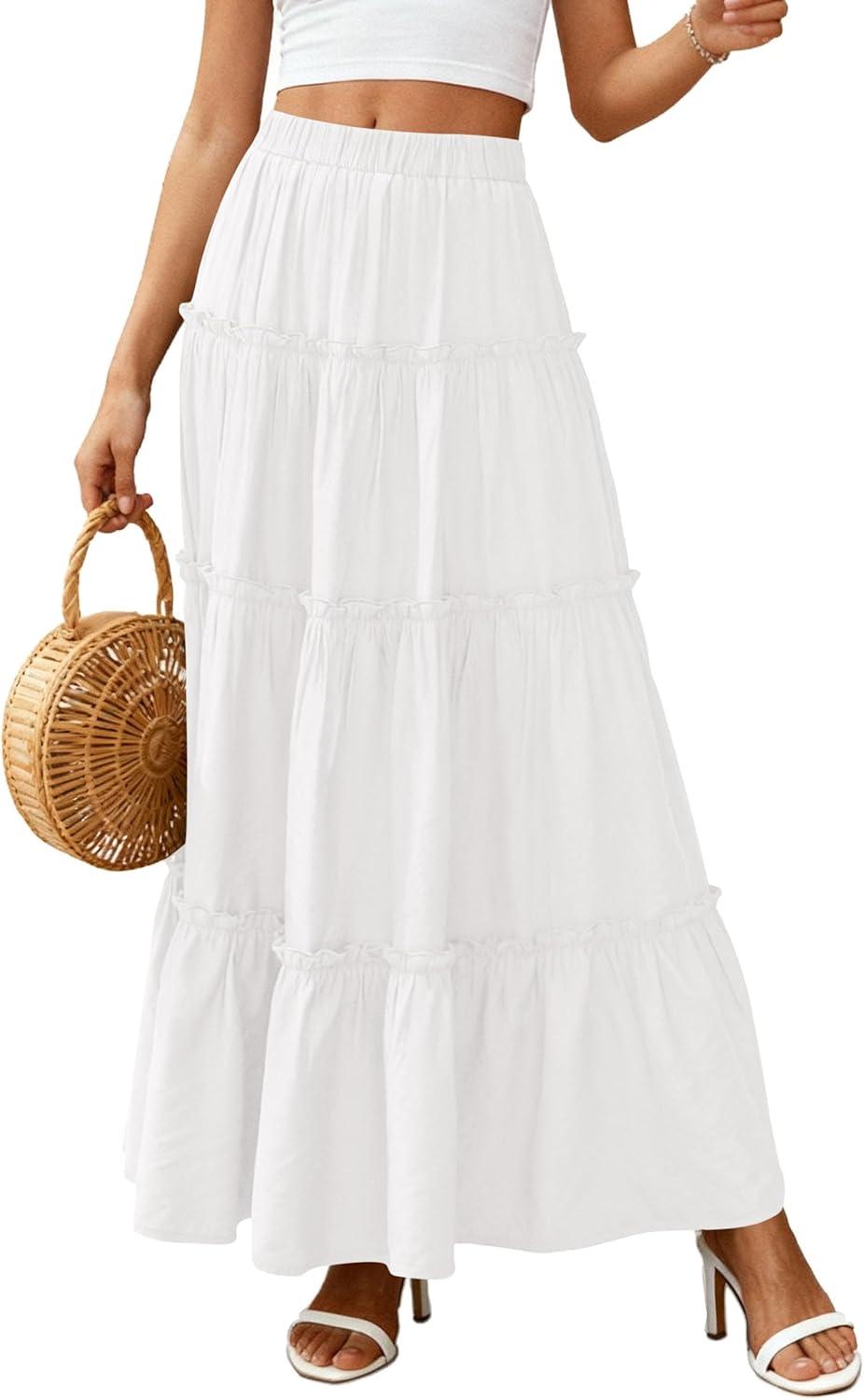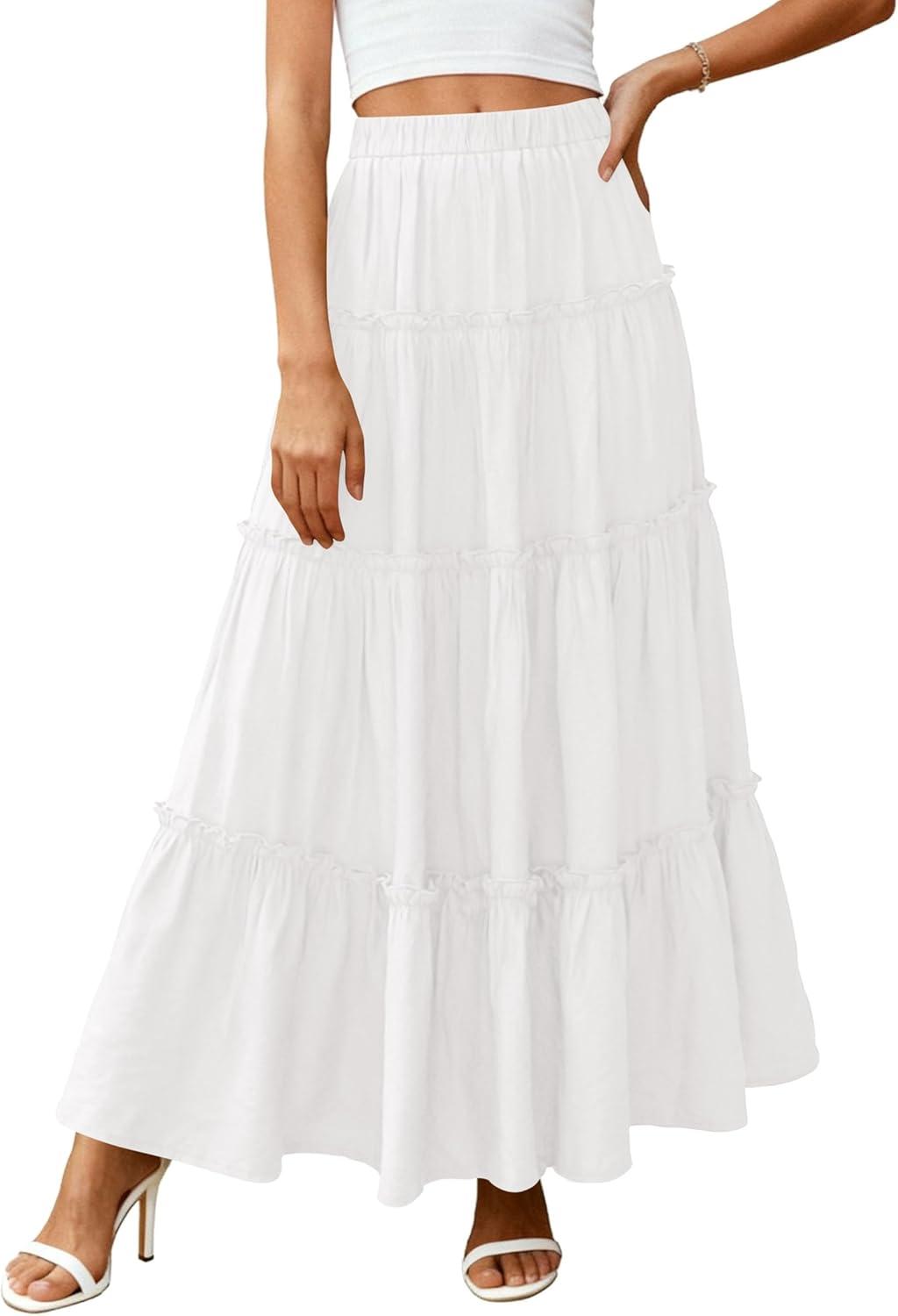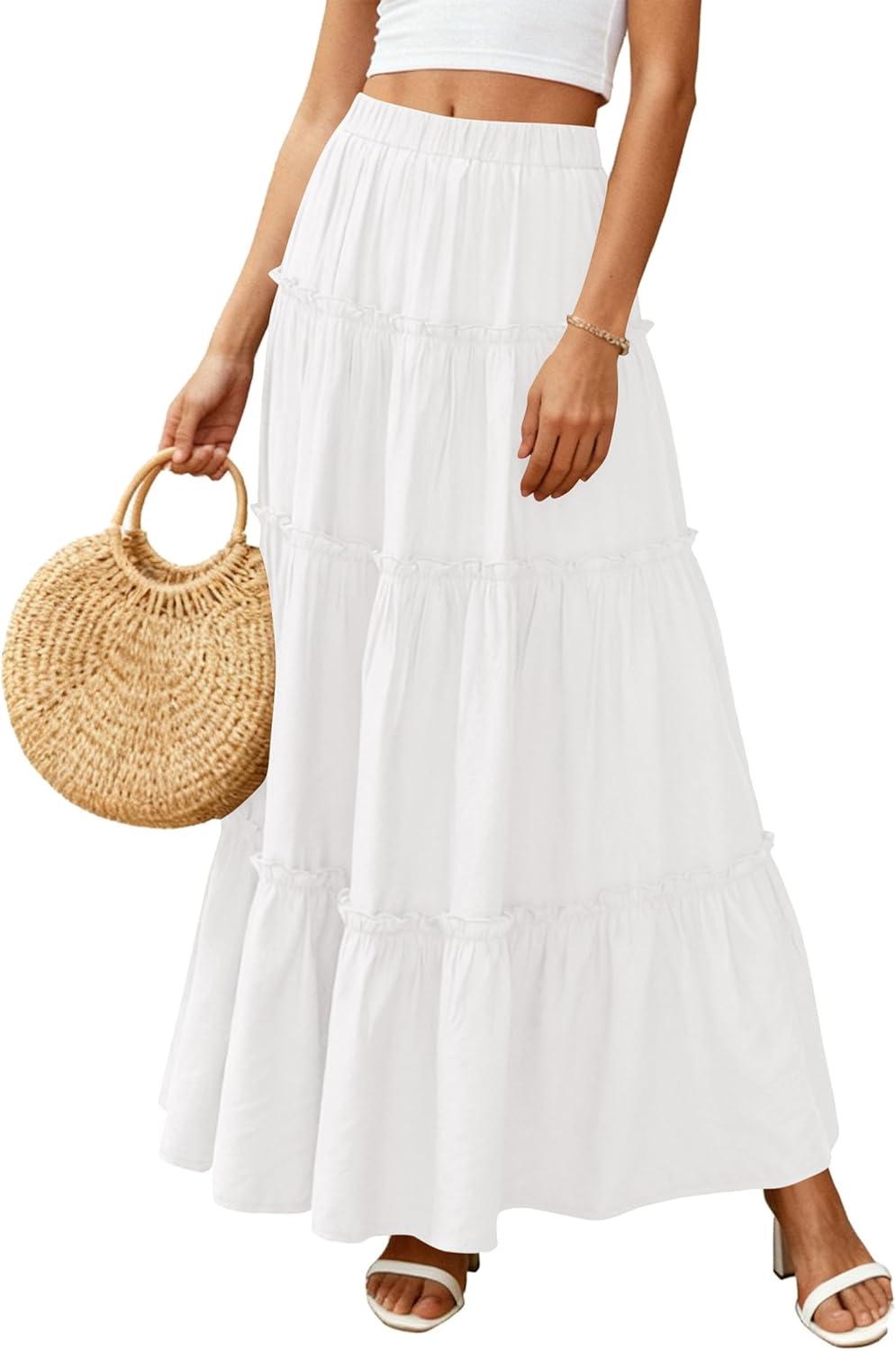 PRETTYGARDEN Women’s Tiered Maxi Skirt Summer Spring Fashion 2026 High Waisted Long Flowy Casual Boho Beach Vacation Clothes(White)