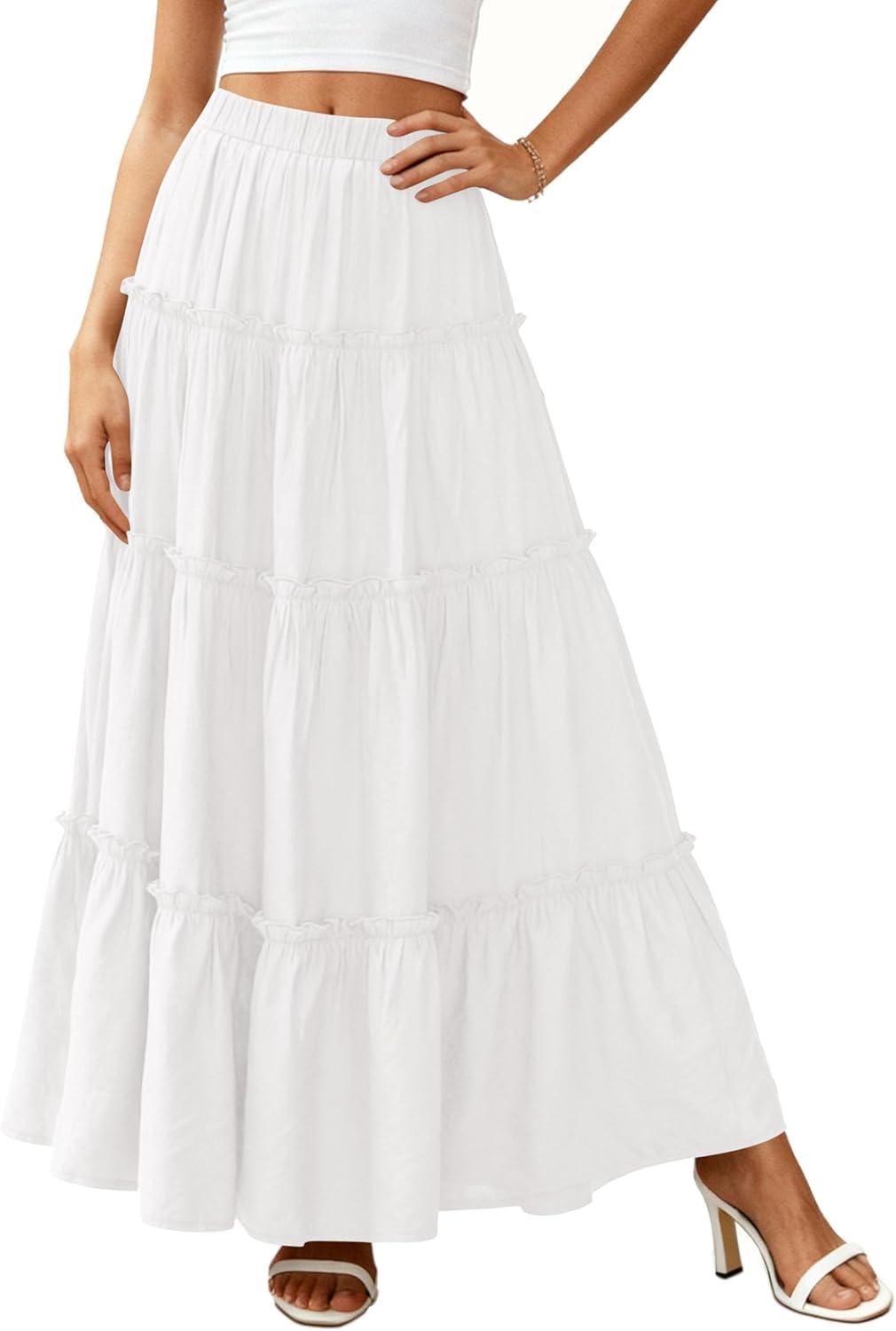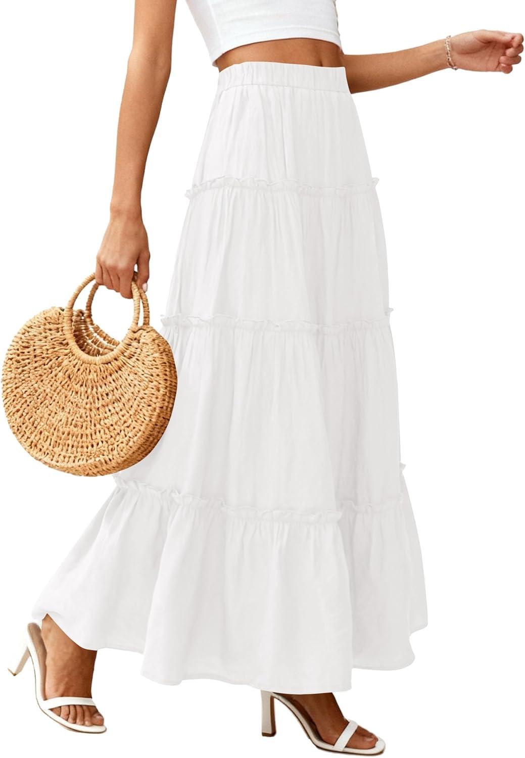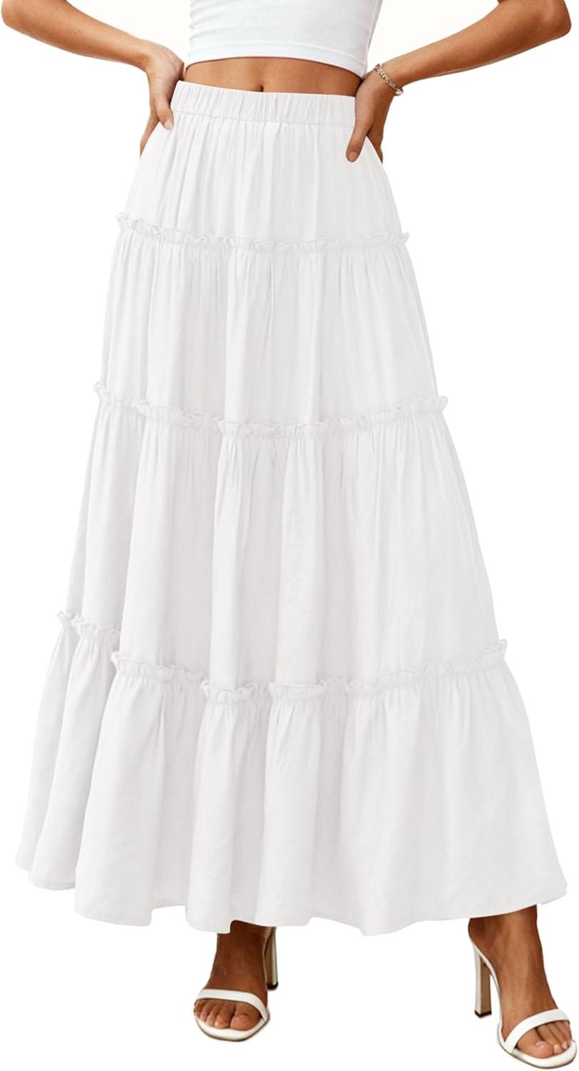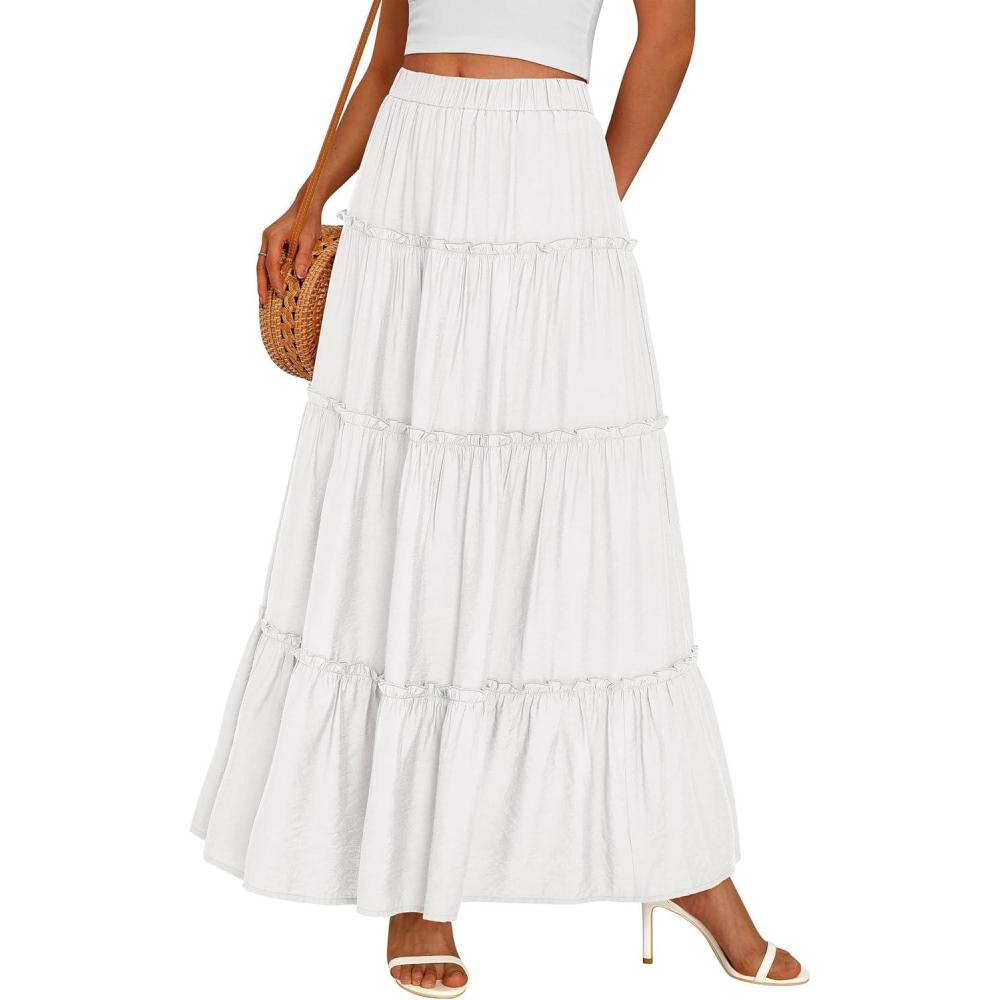 PRETTYGARDEN Women’s Tiered Maxi Skirt Summer Spring Fashion 2026 High Waisted Long Flowy Casual Boho Beach Vacation Clothes(White)