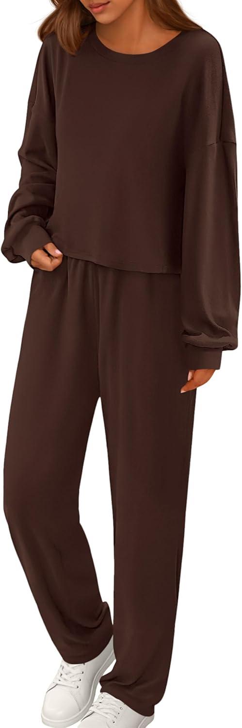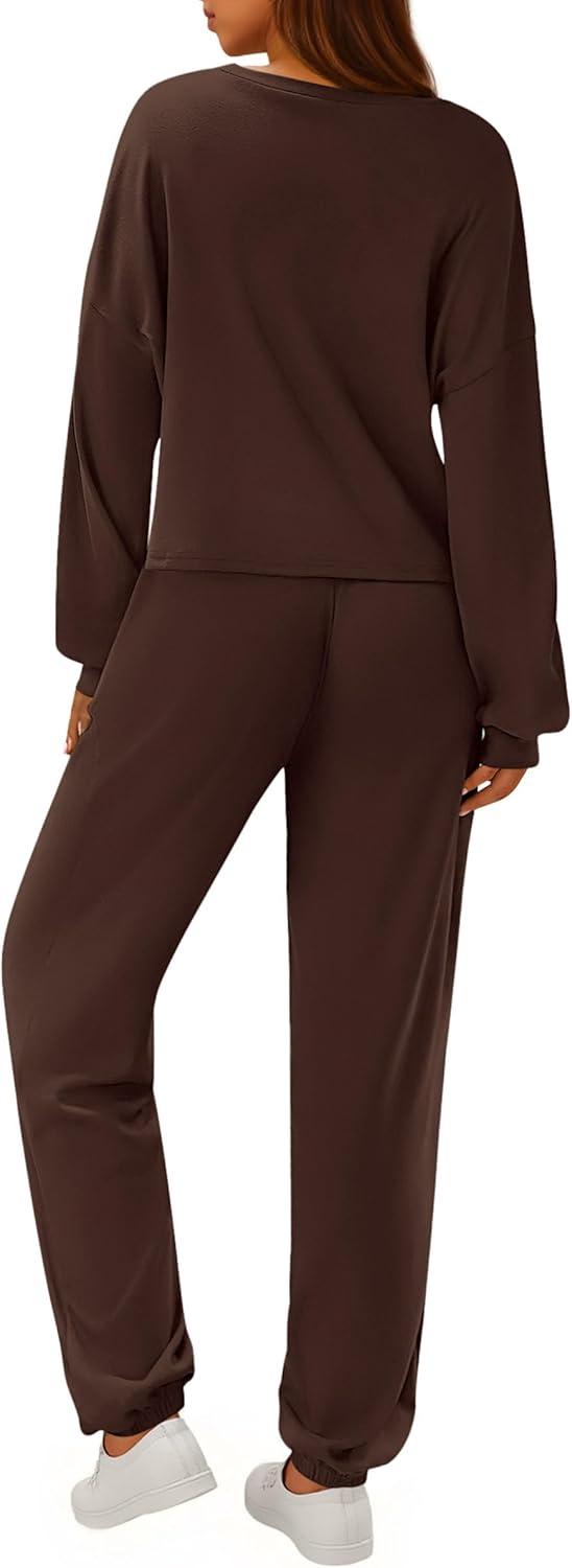 PRETTYGARDEN Women's Two Piece Lounge Sets 2025 Fall Airport Outfits Long Sleeve Pullover Tops Sweatpants Matching Clothing(Brown)
