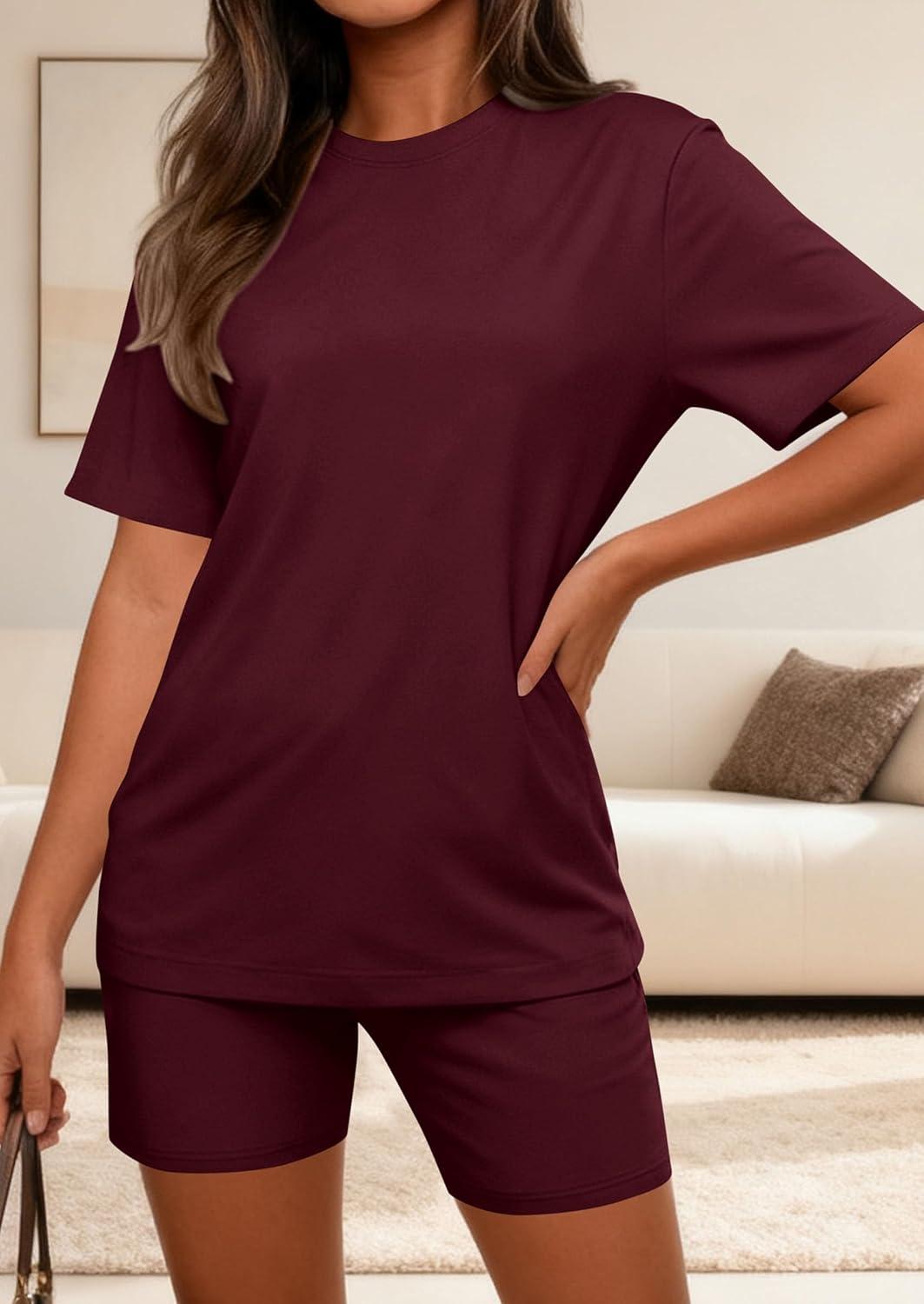 PRETTYGARDEN Women's Two Piece Matching Lounge Sets Summer Casual Tops Short Sleeve Shirts Shorts 2026 Travel Airport Outfits(Burgundy)