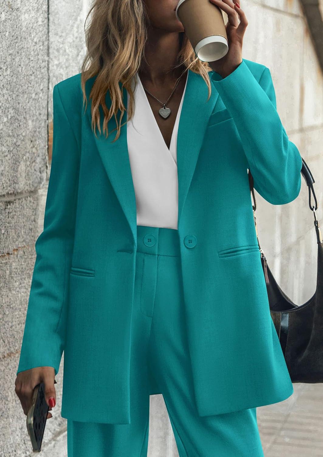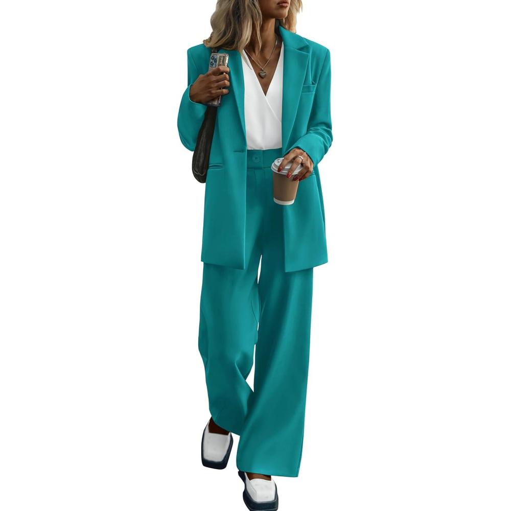 PRETTYGARDEN Women’s Two Piece Outfits Dressy Blazer Jacket Wide Leg Pants 2025 Fall Business Casual Office Work Suit Sets(Blue Green)