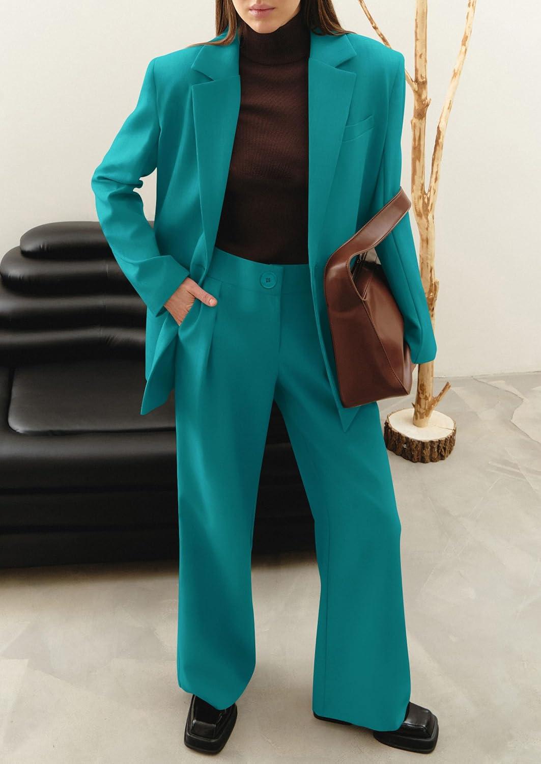 PRETTYGARDEN Women's Two Piece Outfits Dressy Blazer Jacket Wide Leg Pants 2025 Fall Business Casual Office Work Suit Sets(Blue Green)