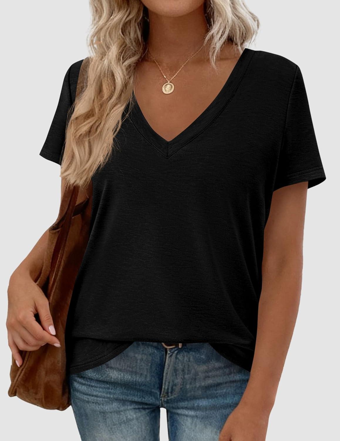 PRETTYGARDEN Women's V Neck T Shirts Summer 2026 Short Sleeve Spring Going Out Tops Casual Loose Fit Basic Tees Beach Clothes(Black)