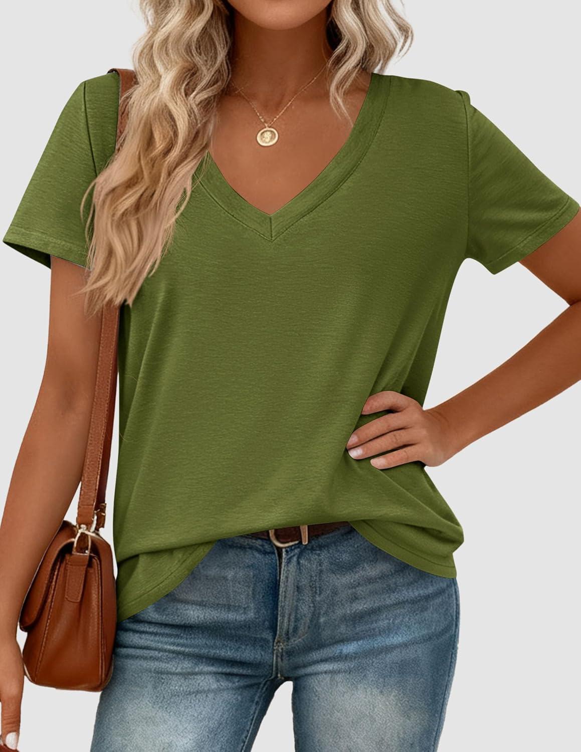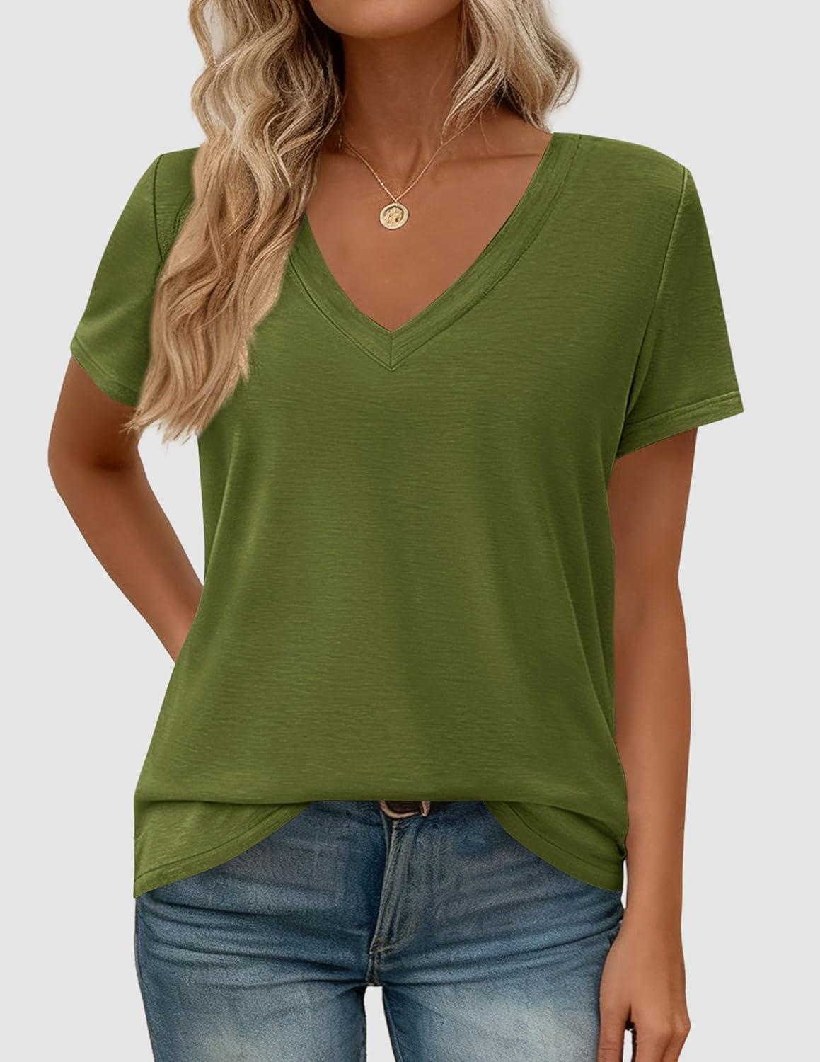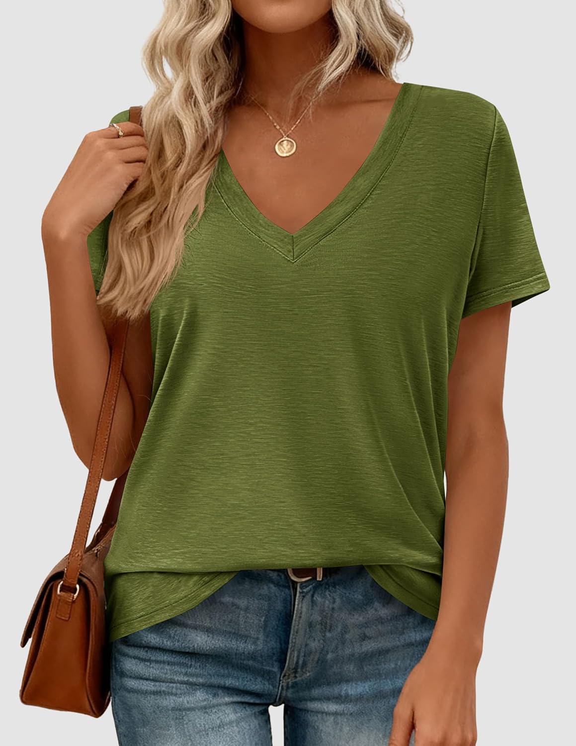 PRETTYGARDEN Women's V Neck T Shirts Summer 2026 Short Sleeve Spring Going Out Tops Casual Loose Fit Basic Tees Beach Clothes(Green)