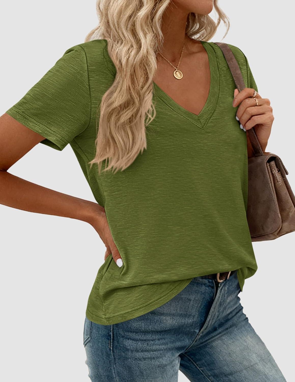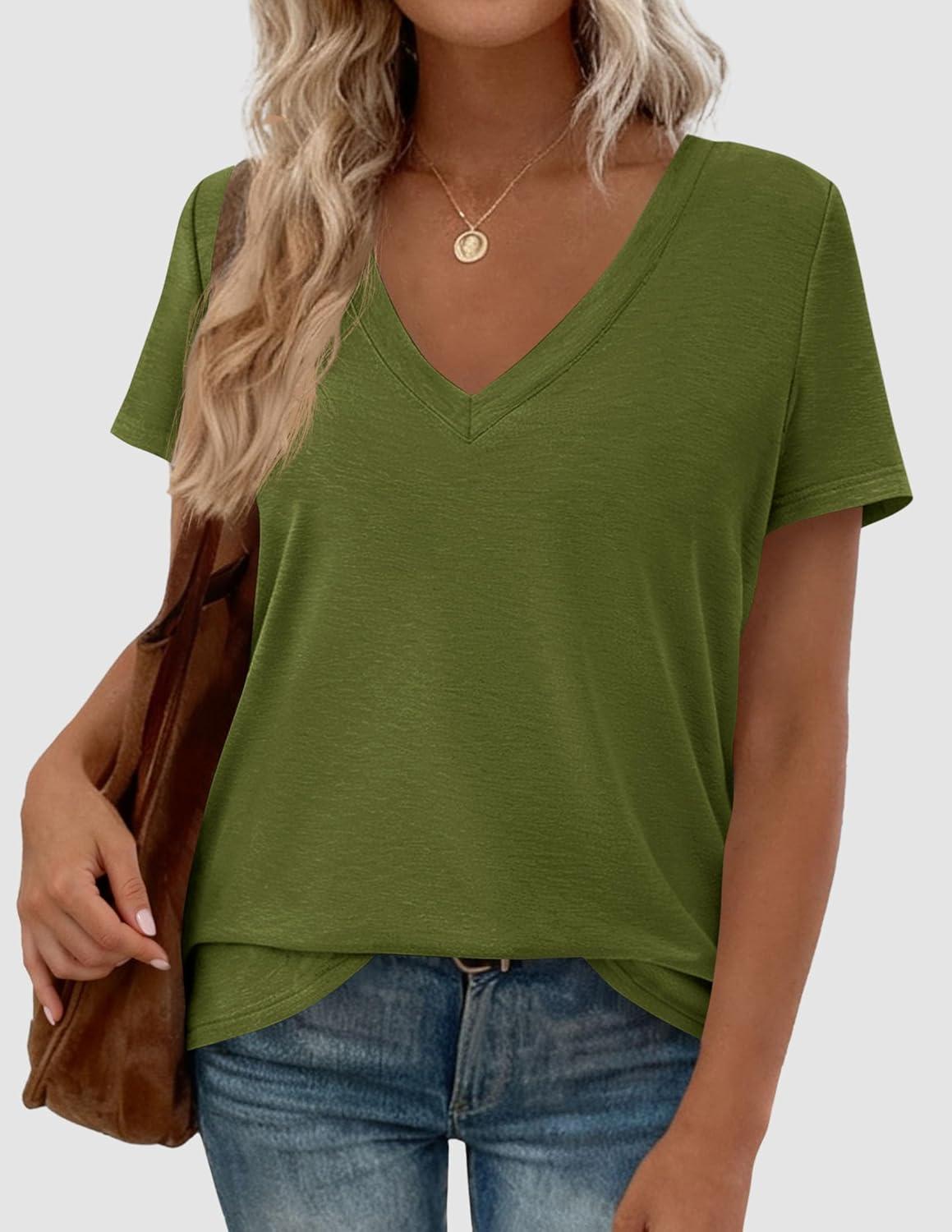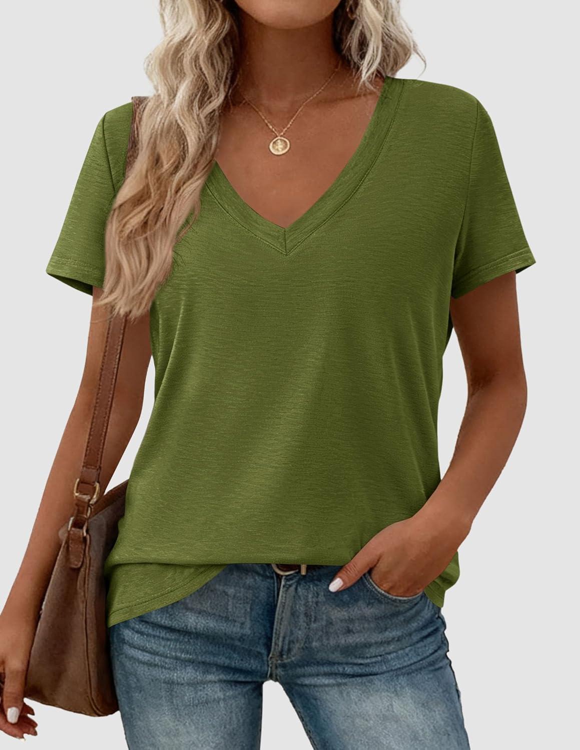 PRETTYGARDEN Women's V Neck T Shirts Summer 2026 Short Sleeve Spring Going Out Tops Casual Loose Fit Basic Tees Beach Clothes(Green)